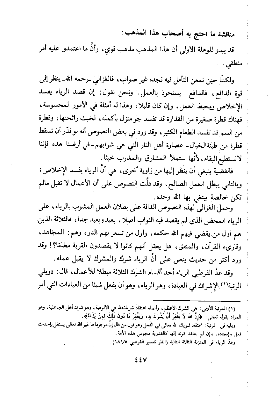 وحمل الغزالي لهذه النصوص الدالة على بطلان العمل المشوب بالرياء، على الرياء المحض الذي لم يقصد فيه الثواب أصلا، بعيد وبعيد جدا، فالثلاثة الذين هم أول من يقضي فيهم الله حكمه، وأول من تسعر بهم النار، وهم: المجاهد، وقارىء القرآن، والمنفق، هل يعقل أنهم كانوا لا يقصدون القربة مطلقا؟! وقد ورد أكثر من حديث ينص على أنَّ الرياء شرك والمشرك لا يقبل عمله.