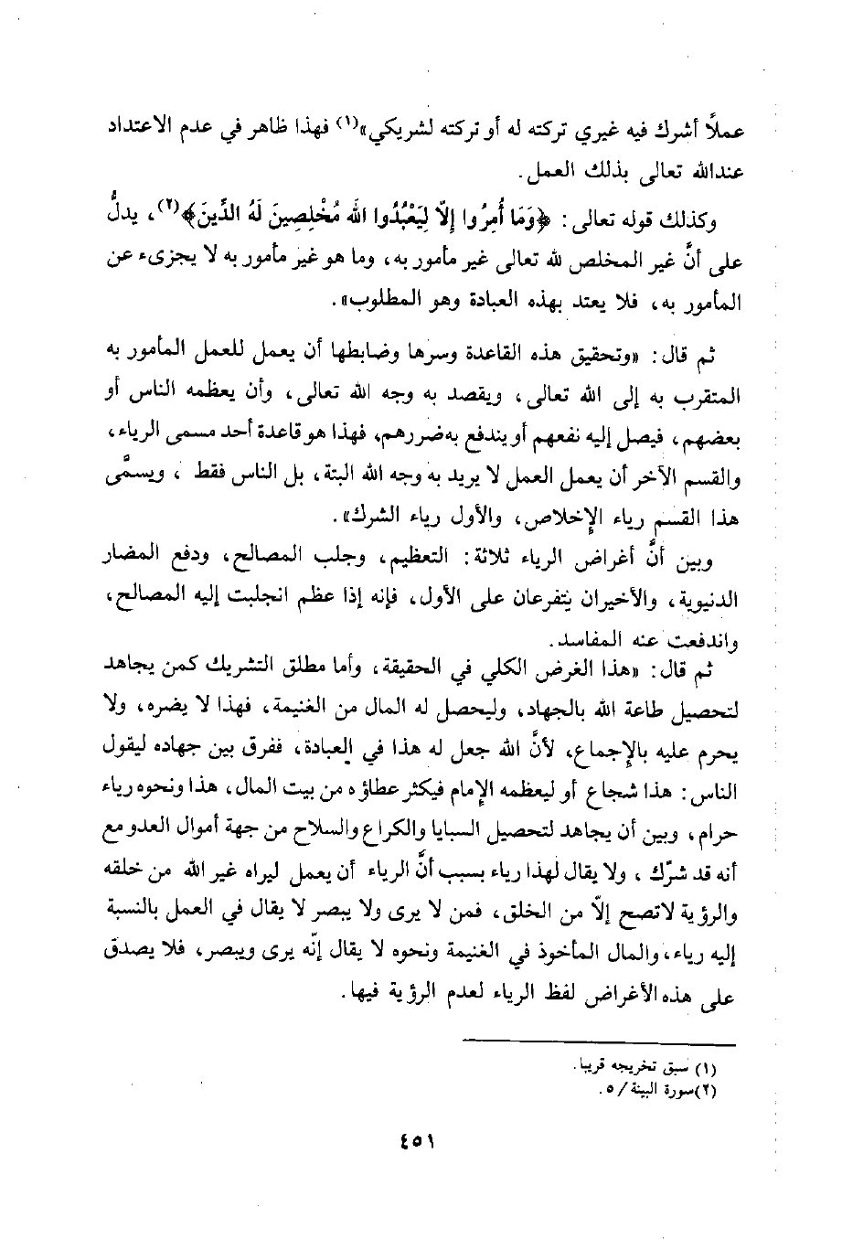 ثم قال: "هذا الغرض الكلي في الحقيقة، وأما مطلق التشريك كمن يجاهد لتحصيل طاعة الله بالجهاد، وليحصل له المال من الغنيمة، فهذا لا يضره، ولا يحرم عليه بالإجماع، لأن الله جعل له هذا في العبادة، ففرق بين جهاده ليقول الناس: هذا شجاع أو ليعظمه الإمام فيكثر عطاؤه من بيت المال، هذا ونحوه رياء حرام، وبين أن يجاهد لتحصيل السبايا والكراع والسلاح من جهة أموال العدو مع أنه قد شرك، ولا يقال لهذا رياء بسبب أن الرياء أن يعمل ليراه غير الله من خلقه والرؤية لا تصح إلاّ من الخلق، فمن لا يرى ولا يبصر لا يقال في العمل بالنسبة إليه رياء، والمال المأخوذ في الغنيمة ونحوه لا يقال إنّه يرى ويبصر، فلا يصدق على هذه الأغراض لفظ الرياء لعدم الرؤية فيها.