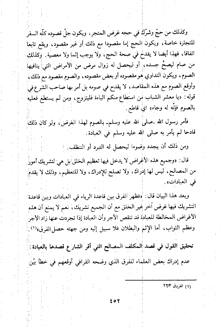 وكذلك من حج وشرّك في حجه غرض المتجر، ويكون جلّ قصوده كلّه السفر للتجارة خاصة، ويكون الحج إما مقصودا مع ذلك أو غير مقصود، ويقع تابعا اتفاقا، فهذا أيضا لا يقدح في صحة الحج، ولا يوجب إثما ولا معصية. وكذلك من صام ليصح جسده، أو ليحصل له زوال مرض من الأمراض التي ينافيها الصوم، ويكون التداوي هو مقصوده أو بعض مقصوده، والصوم مقصود مع ذلك، وأوقع الصوم مع هذه المقاصد، لا يقدح في صومه بل أمر بها صاحب الشرع في قوله: "يا معشر الشباب من استطاع منكم الباءة فليتزوج، ومن لم يستطع فعليه بالصوم فإنّه له وجاء" أي قاطع.