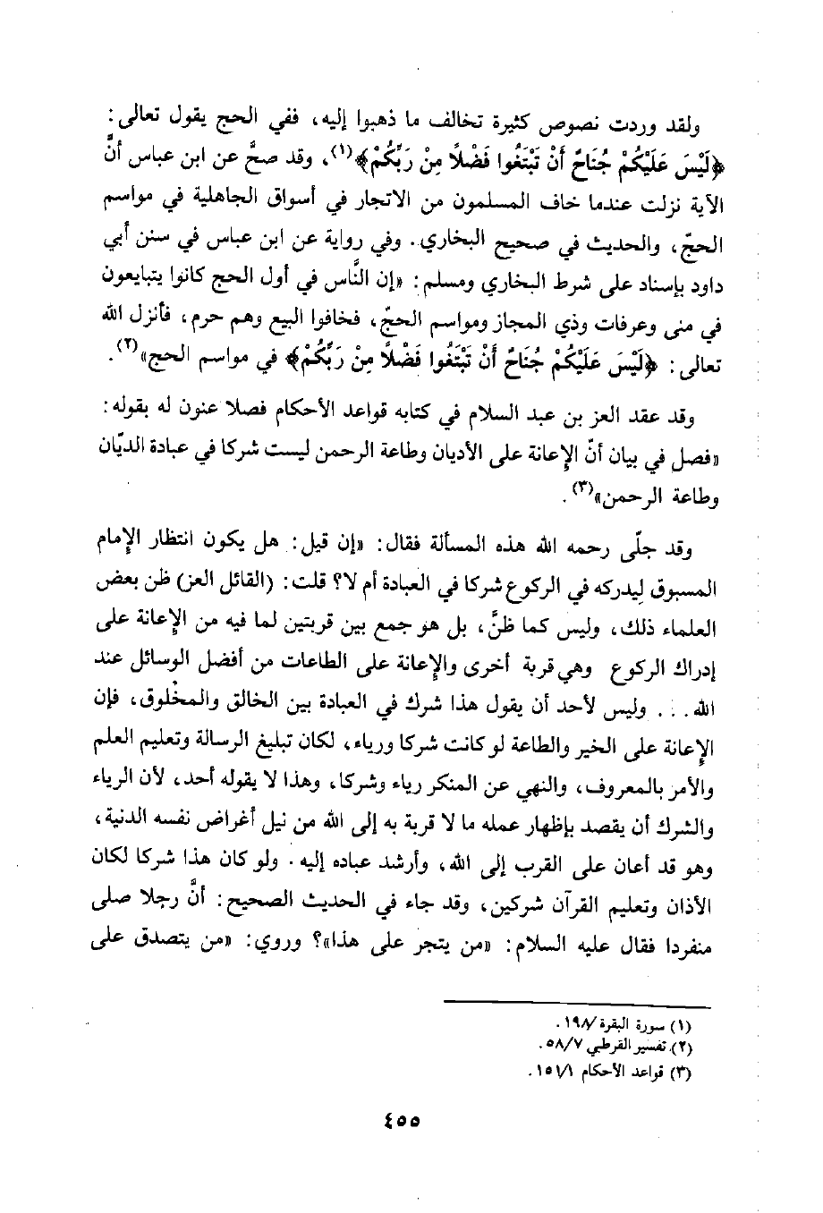 وقد عقد العز بن عبد السلام في كتابه قواعد الأحكام فصلا عنون له بقوله: "فصل في بيان أنّ الإعانة على الأديان وطاعة الرحمن ليست شركا في عبادة الديان وطاعة الرحمن" (¬3).
