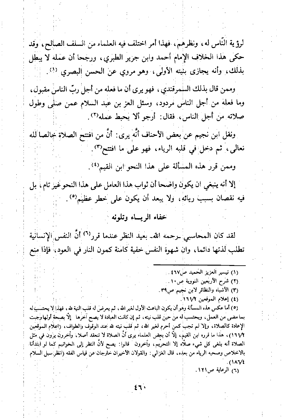 (¬5) أما عكس هذه المسألة وهو أن يكون الباعث الأول لغير الله، ثم يعرض له قلب النية لله، فهذا لا يحتسب له بما مضى من العمل، ويحتسب له من حين قلب نيته، ثم إن كانت العبادة لا يصح آخرها إلا بصحة أولها وجبت الإعادة كالصلاة، إلا لم تجب كمن أحرم لغير الله، ثم قلب نيته لله الوقوف والطواف، (إعلام الموقعين 2/ 161)، هذا ما قرره ابن القيم، إلاّ أن بعض العلماء يرى أن الصلاة لا تنعقد أصلا، وآخرون يرون في مثل الصلاة أنه يلغى كل شيء صلاه إلا التحريم، وآخرون قالوا: يصح لأن النظر إلى الخواتيم كما لو ابتدأنا بالإخلاص وصحبه الرياء من بعده، قال الغزالي: والقولان الأخيران خارجان عن قياس الفقه (انظر سبل السلام 4/ 187).