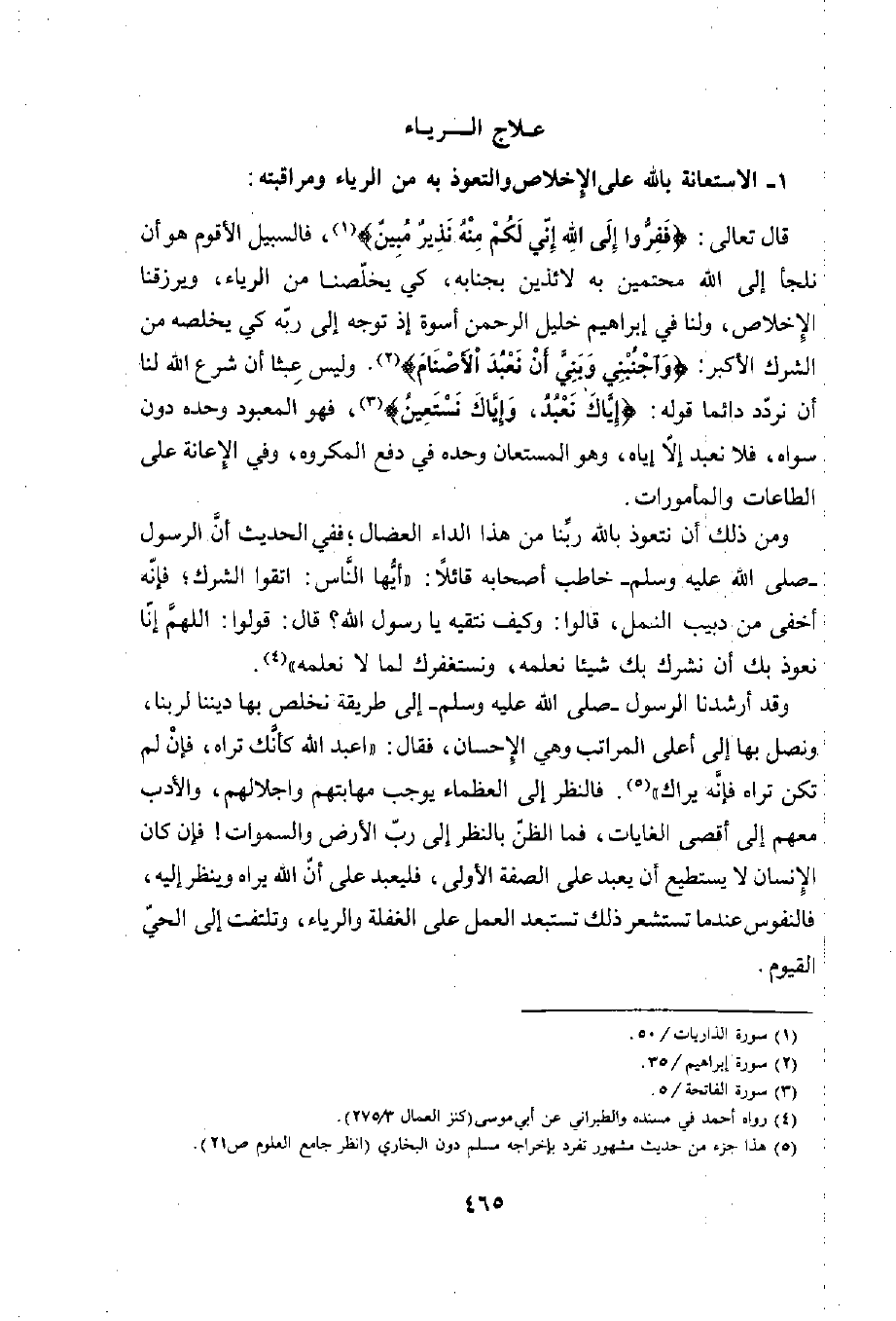 قال تعالى: {فَفِروا إِلَى اللِّه إِنّي لَكُمْ مِنْهُ نَذِير مبينٌ} (¬1)، فالسبيل الأقوم هو أن نلجأ إلى الله محتمين به لائذين بجنابه، كي يخلصنا من الرياء، ويرزقنا الإخلاص، ولنا في إبراهيم خليل الرحمن أسوة إذ توجه إلى ربه كي يخلصه من الشرك الأكبر: {وَاجْنُبْنِي وَبَنِي أنْ نَعْبدَ اْلأصنَامَ} (¬2). وليس عبثا أن شرع الله لنا أن نردّد دائما قوله: {إِيَّاكَ َنعبدُ، وَإيَّاكَ نستَعِينُ} (¬3)، فهو المعبود وحده دون سواه، فلا نعبد إلا إياه، وهو المستعان وحده في دفع المكروه، وفي الإعانة على الطاعات والمأمورات.