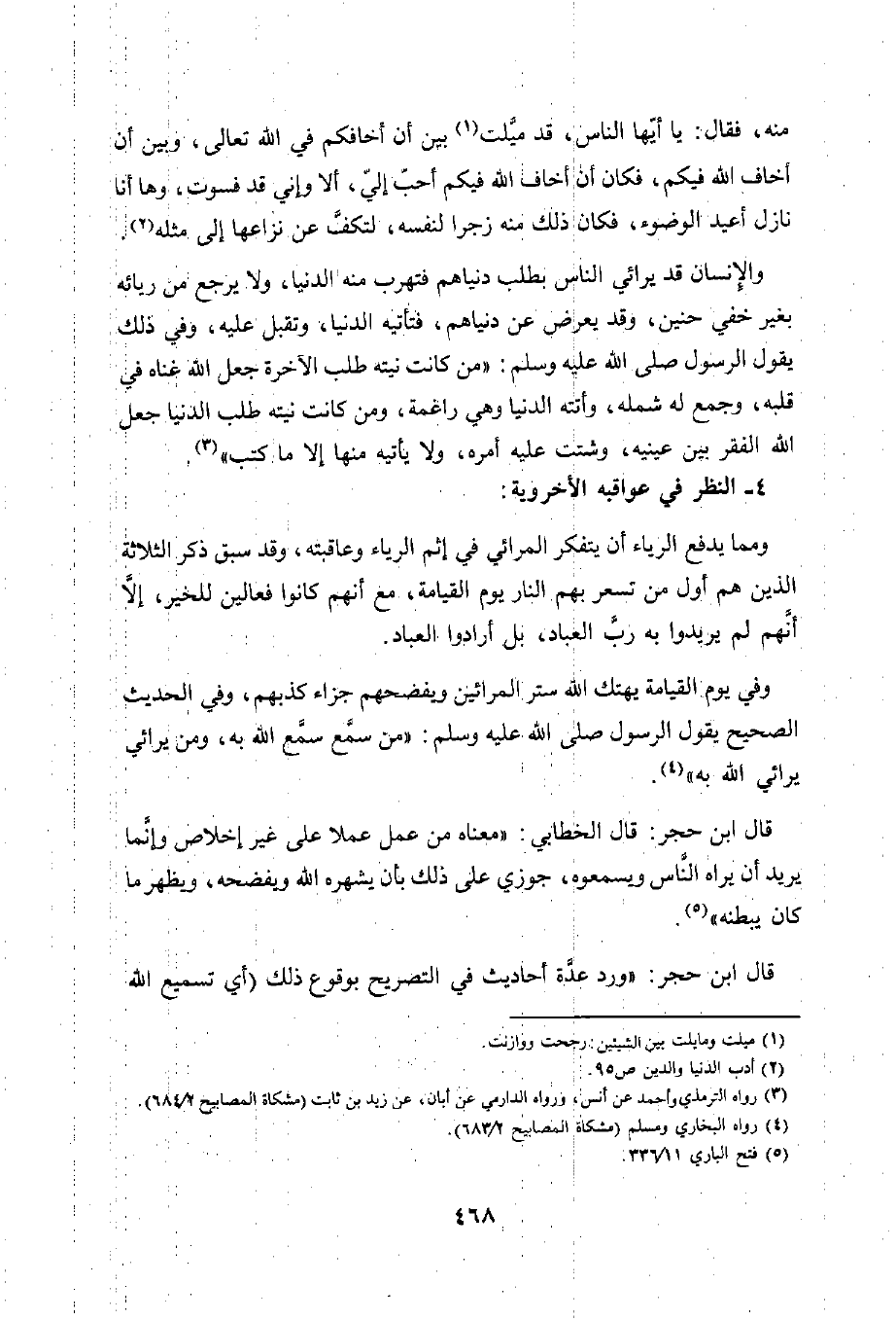 والإنسان قد يرائي الناس بطلب دنياهم فتهرب منه الدنيا، ولا يرجع من ريائه بغير خفي حنين، وقد يعرض عن دنياهم، فتأتيه الدنيا، وتقبل عليه، وفي ذلك يقول الرسول صلى الله عليه وسلم: "من كانت نيته طلب الآخرة جعل الله غناه في قلبه، وجمع له شمله، وأتته الدنيا وهي راغمة، ومن كانت نيته طلب الدنيا جعل الله الفقر بين عينيه، وشتت عليه أمره، ولا يأتيه منها إلا ما كتب" (¬3).