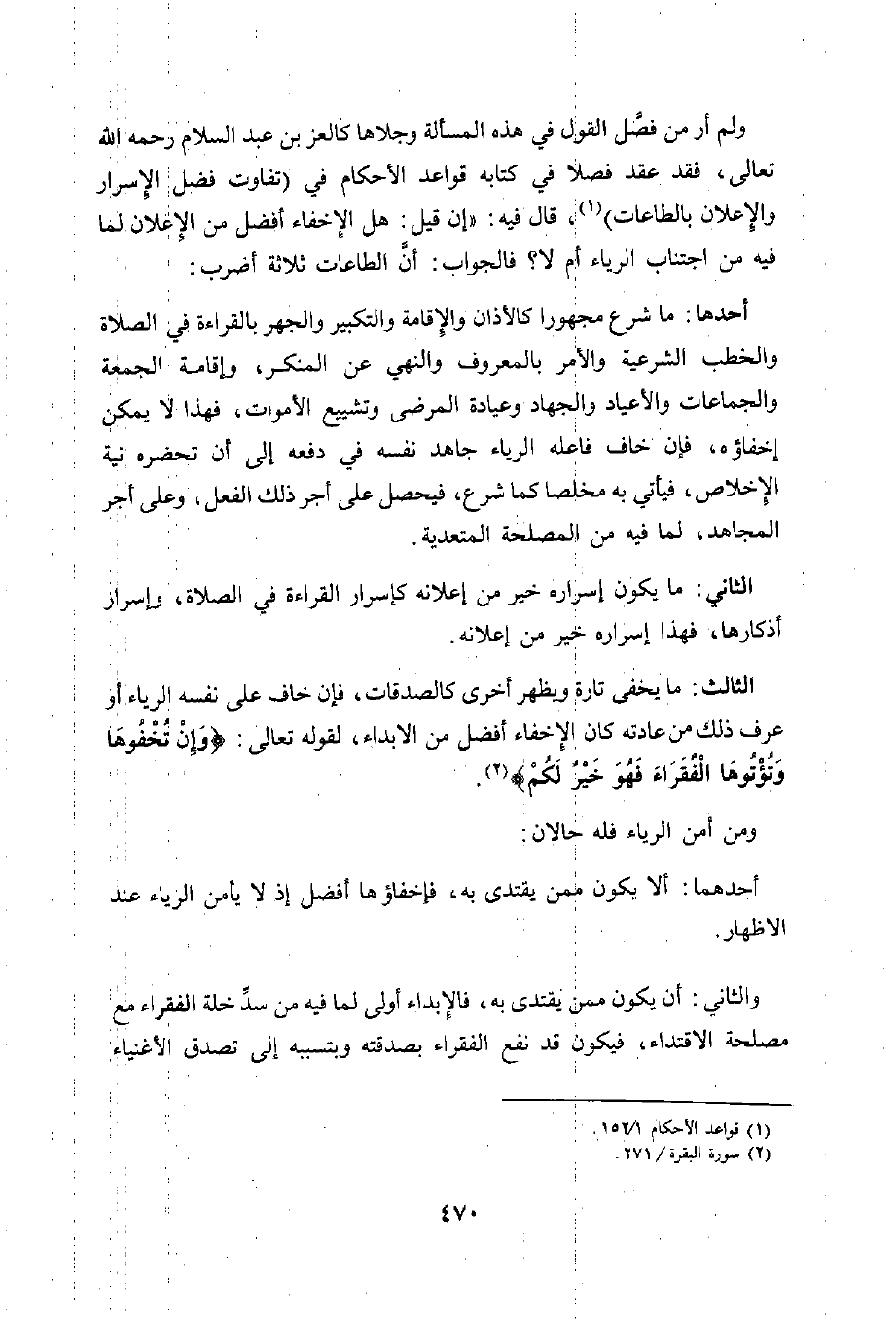 ولم أر من فصَّل القول في هذه المسألة وجلاها كالعز بن عبد السلام رحمه الله تعالى، فقد عقد فصلا في كتابه قواعد الأحكام في (تفاوت فضل الإسرار والإعلان بالطاعات) (¬1)، قال فيه: "إن قيل: هل الإخفاء أفضل من الإعلان لما فيه من اجتناب الرياء أم لا؟ فالجواب: أن الطاعات ثلاثة أضرب: