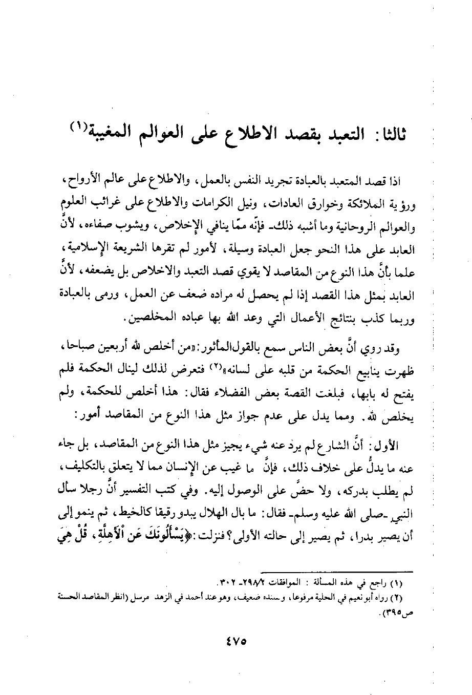 وقد روي أن بعض الناس سمع بالقول المأثور: "من أخلص لله أربعين صباحا، ظهرت ينابيع الحكمة من قلبه على لسانه" (¬2) فتعرض لذلك لينال الحكمة فلم يفتح له بابها، فبلغت القصة بعض الفضلاء فقال: هذا أخلص للحكمة، ولم يخلص لله. ومما يدل على عدم جواز مثل هذا النوع من المقاصد أمور: