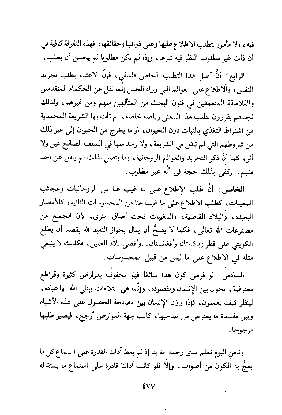 الخامس: أنَّ طلب الِاطلاع على ما غيب عنا من الروحانيات وعجائب المغيبات، كطلب الاطلاع على ما غيب عنا من المحسوسات النائية، كالأمصار البعيدة، والبلاد القاصية، والمغيبات تحت أطباق الثرى، لأن الجميع من مصنوعات الله تعالى، فكما لا يصحّ أن يقال بجواز التعبد لله بقصد أن يطلع الكويتي على قطر وباكستان وأفغانستان .. وأقصى بلاد الصين، فكذلك لا ينبغي مثله في الاطلاع على ما ليس من قبيل المحسوسات.