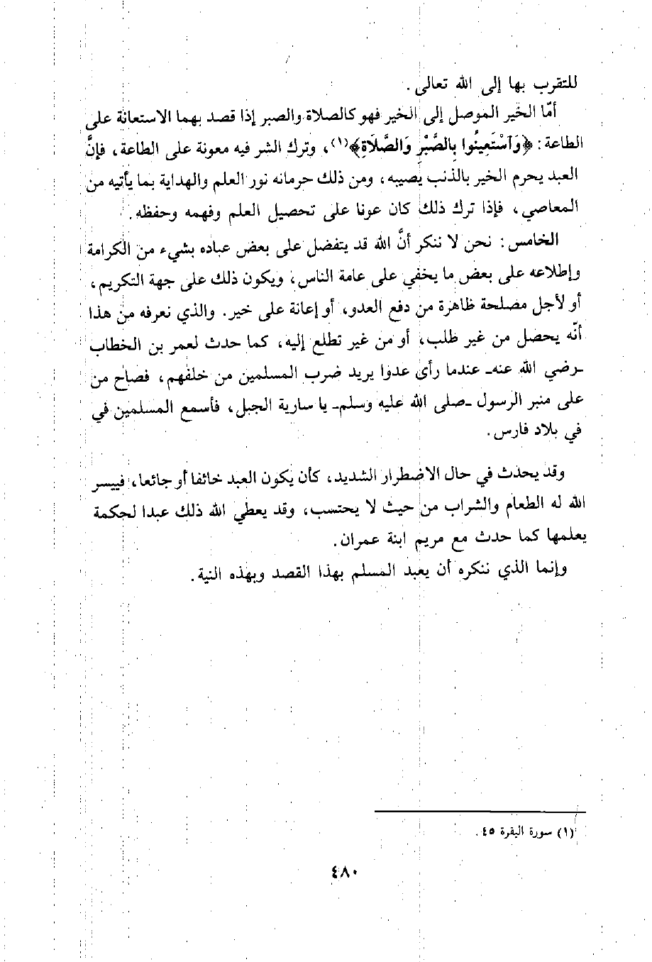 أمّا الخير الموصل إلى الخير فهو كالصلاة والصبر إذا قصد بهما الاستعانة عليه الطاعة: {وَاستعِينُوا بِالصَّبْرِ وَالصَّلاَةِ} (1)، وترك الشر فيه معونة على الطاعة، فإن العبد يحرم الخير بالذنب يصيبه، ومن ذلك حرمانه نور العلم والهداية بما يأتيه من المعاصي، فإذا ترك ذلك كان عونا على تحصيل العلم وفهمه وحفظه.