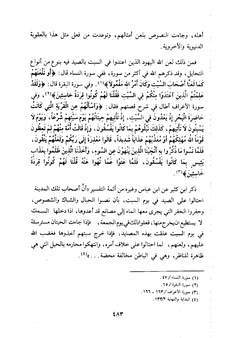 فمن ذلك لعن الله اليهود الذين اعتدوا في السبت بالصيد فيه بنوع من أنواع التحايل، وقد ذكرهم الله في أكثر من سورة، ففي سورة النساء قال: {أو نَلْعَنَهُمْ كَمَا لَعَنَّا أَصْحَابَ السبت وَكَانَ أَمْرُ الله مَفْعُولاَ} (¬1). وفي سورة البقرة قال: {وَلَقَدْ عَلِمْتمُ الِّذِينَ أعْتَدَوْا منْكُمْ فِي السبت فَقلْنا لَهُمْ كونُوا قِرَدَةً خاسِئِينَ} (¬2)، وفي سورة الأعراف أطال في شرح قصتهم فقال: {وَاسْأَلْهُمْ عَنِ الْقَرْيَةِ الَّتِي كَانَتْ حَاضِرَةَ الْبَحْرِ إِذْ يَعْدُونَ فِي السَّبْتِ إِذْ تَأْتِيهِمْ حِيتَانُهُمْ يَوْمَ سَبْتِهِمْ شُرَّعًا وَيَوْمَ لَا يَسْبِتُونَ لَا تَأْتِيهِمْ كَذَلِكَ نَبْلُوهُمْ بِمَا كَانُوا يَفْسُقُونَ (163) وَإِذْ قَالَتْ أُمَّةٌ مِنْهُمْ لِمَ تَعِظُونَ قَوْمًا اللَّهُ مُهْلِكُهُمْ أَوْ مُعَذِّبُهُمْ عَذَابًا شَدِيدًا قَالُوا مَعْذِرَةً إِلَى رَبِّكُمْ وَلَعَلَّهُمْ يَتَّقُونَ (164) فَلَمَّا نَسُوا مَا ذُكِّرُوا بِهِ أَنْجَيْنَا الَّذِينَ يَنْهَوْنَ عَنِ السُّوءِ وَأَخَذْنَا الَّذِينَ ظَلَمُوا بِعَذَابٍ بَئِيسٍ بِمَا كَانُوا يَفْسُقُونَ (165) فَلَمَّا عَتَوْا عَنْ مَا نُهُوا عَنْهُ قُلْنَا لَهُمْ كُونُوا قِرَدَةً خَاسِئِينَ} (¬3).