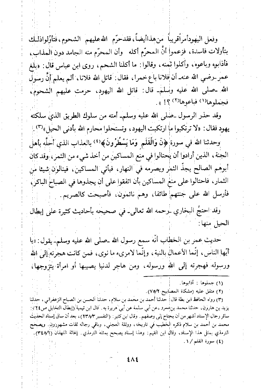 وفعل اليهود أمرًا قريبًا من هذا أيضًا، فقد حرّم الله عليهم الشحوم، فتأوّلوا ذلك تأولات فاسدة، فزعموا أن المحرّم أكله وأن المحرم منه الجامد دون المذاب، فأذابوه وباعوه، وأكلوا ثمنه، وقالوا: ما أكلنا الشحم، روى ابن عباس قال: "بلغ عمر -رضي الله عنه- أن فلانا باع خمرا، فقال: قاتل الله فلانا، ألم يعلم أن رسول الله -صلى الله عليه وسلم- قال: قاتل الله اليهود، حرمت عليهم الشحوم، فجملوها (¬1) فباعوها (¬2)؟! ".