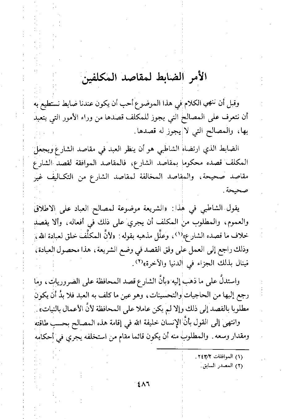 الضابط الذي ارتضاه الشاطبي هو أن ينظر العبد في مقاصد الشارع ويجعل المكلف قصده محكوما بمقاصد الشارع، فالمقاصد الموافقة لقصد الشارع مقاصد صحيحة، والمقاصد المخالفة لمقاصد الشارع من التكالف غير صحيحة.