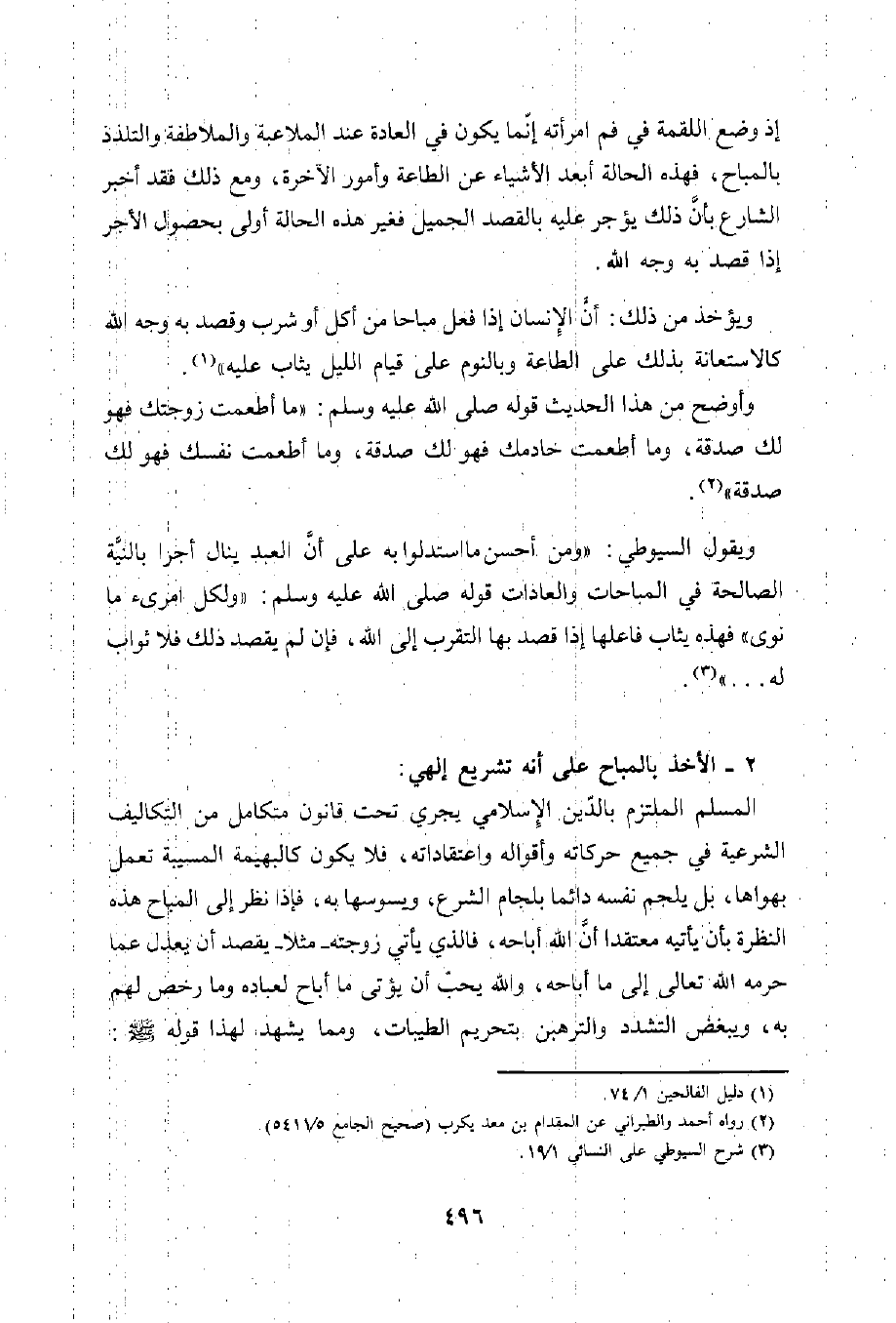 المسلم الملتزم بالدّين الإسلامي يجري تحت قانون متكامل من التكاليف الشرعية في جميع حركاته وأقواله واعتقاداته، فلا يكون كالبهيمة المسيبة تعمل بهواها، بل يلجم نفسه دائما بلجام الشرع، ويسوسها به، فإذا نظر إلى المباح هذه النظرة بأن يأتيه معتقدا أنَّ الله أباحه، فالذي يأتي زوجته -مثلا- يقصد أن يعدل عما حرمه الله تعالى إلى ما أباحه، والله يحب أن يؤتى ما أباح لعباده وما رخص لهم به، ويبغض التشدد والترهبن بتحريم الطيبات، ومما يشهد لهذا قوله -صلى الله عليه وسلم -: