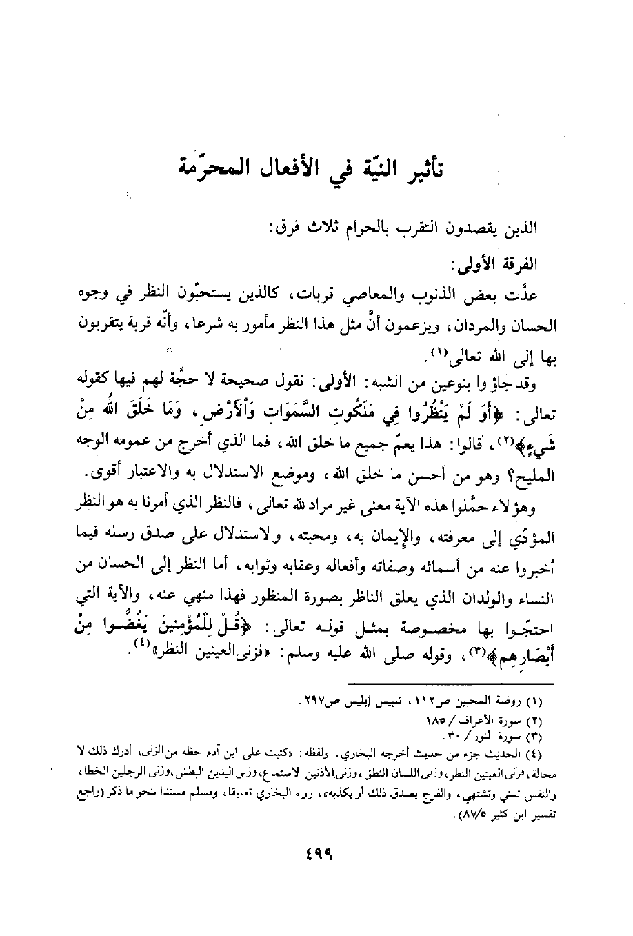 (¬4) الحديث جزء من حديث أخرجه البخاري، ولفظه: "كتبت على ابن آدم حظه من الزنى، أدرك ذلك لا محالة، فزنى العينين النظر، وزنى اللسان النطق، وزنى الأذنين الاستماع، وزنى اليدين البطش، وزنى الرجلين الخطا، والنفس تمني وتشتهي، والفرج يصدق ذلك أو يكذبه"، رواه البخاري تعليقا، ومسلم مستندا بنحو ما ذكر (راجع تفسير ابن كثير 5/ 87).