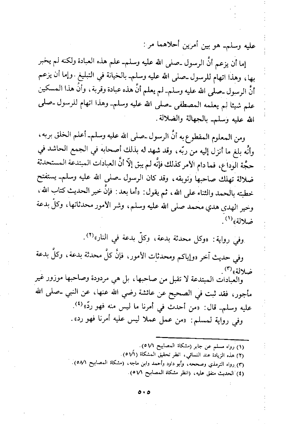 إما أن يزعم أنَّ الرسول -صلى الله عليه وسلم- علم هذه العبادة ولكنه لم يخبر بها، وهذا اتهام للرسول -صلى الله عليه وسلم- بالخيانة في التبليغ. وإما أن يزعم أن الرسول -صلى الله عليه وسلم- لم يعلم أن هذه عبادة وقربة، وأن هذا المسكين علم شيئًا لم يعلمه المصطفى -صلى الله عليه وسلم- وهذا اتهام للرسول -صلى الله عليه وسلم- بالجهالة والضلالة.