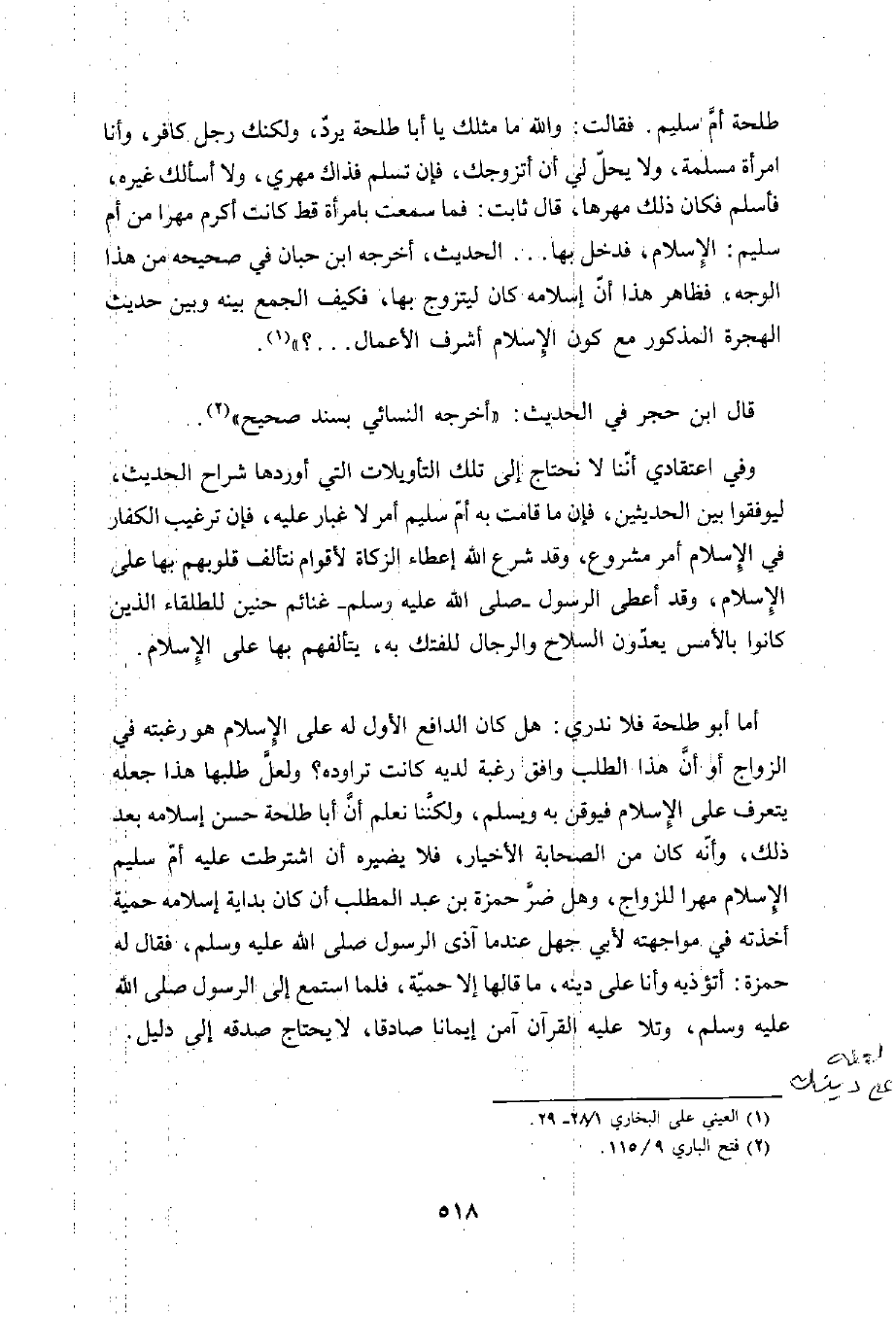 وفي اعتقادي أنّنا لا نحتاج إلى تلك التأويلات التي أوردها شراح الحديث، ليوفقوا بين الحديثين، فإن ما قامت به أم سليم أمر لا غبار عليه، فإن ترغيب الكفار في الِإسلام أمر مشروع، وقد شرع الله إعطاء الزكاة لأقوام نتألف قلوبهم بها على الِإسلام، وقد أعطى الرسول -صلى الله عليه رسلم- غنائم حنين للطلقاء الذين كانوا بالأمس يعدون السلاح والرجال للفتك به، يتألفهم بها على الِإسلام.