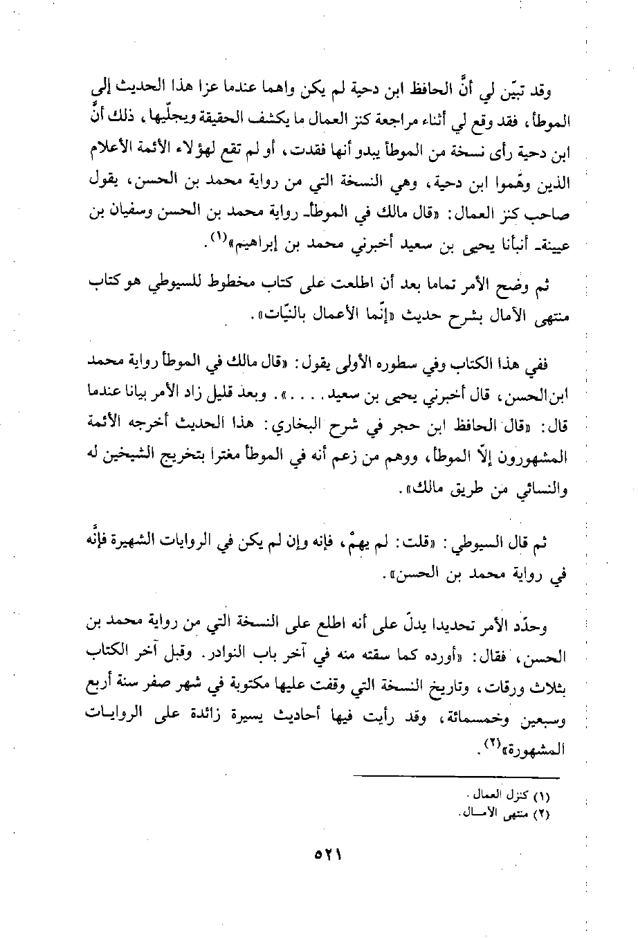 وقد تبين لي أن الحافظ ابن دحية لم يكن واهما عندما عزا هذا الحديث إلى الموطأ، فقد وقع لي أثناء مراجعة كنز العمال ما يكشف الحقيقة ويجليها، ذلك أن ابن دحية رأى نسخة من الموطأ يبدو أنها فقدت، أو لم تقع لهؤلاء الأئمة الأعلام الذين وهموا ابن دحية، وهي النسخة التي من رواية محمد بن الحسن، يقول صاحب كنز العمال: "قال مالك في الموطأ -رواية محمد بن الحسن وسفيان بن عيينة- أنبأنا يحيى بن سعيد أخبرني محمد بن إبراهيم" (¬1).