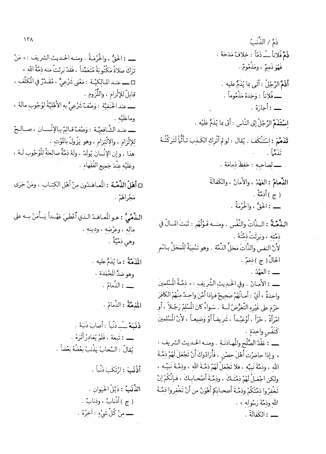 -: الامان، وفي الحديث الشريف: " ذمة المسلمين واحدة " أي: أمانهم صحيح فإذا أمن واحد منهم الكافر حرم على غيره التعرض له.