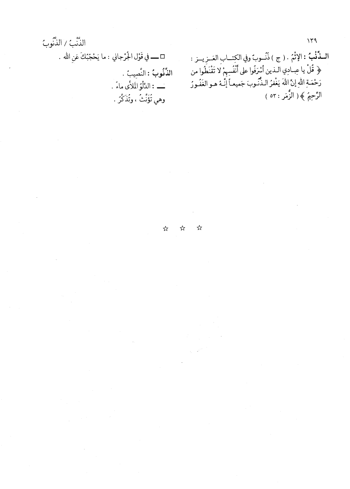 (ج) ذنوب وفي الكتاب العزيز: (قل يا عبادي الذين أسرفوا على أنفهسم لا تقنطوا من رحمة الله إن الله يغفر الذنوب جميعا إنه هو الغفور الرحيم) (الزمر: 53) - في قول الجرجاني: ما يحجبك عن الله.