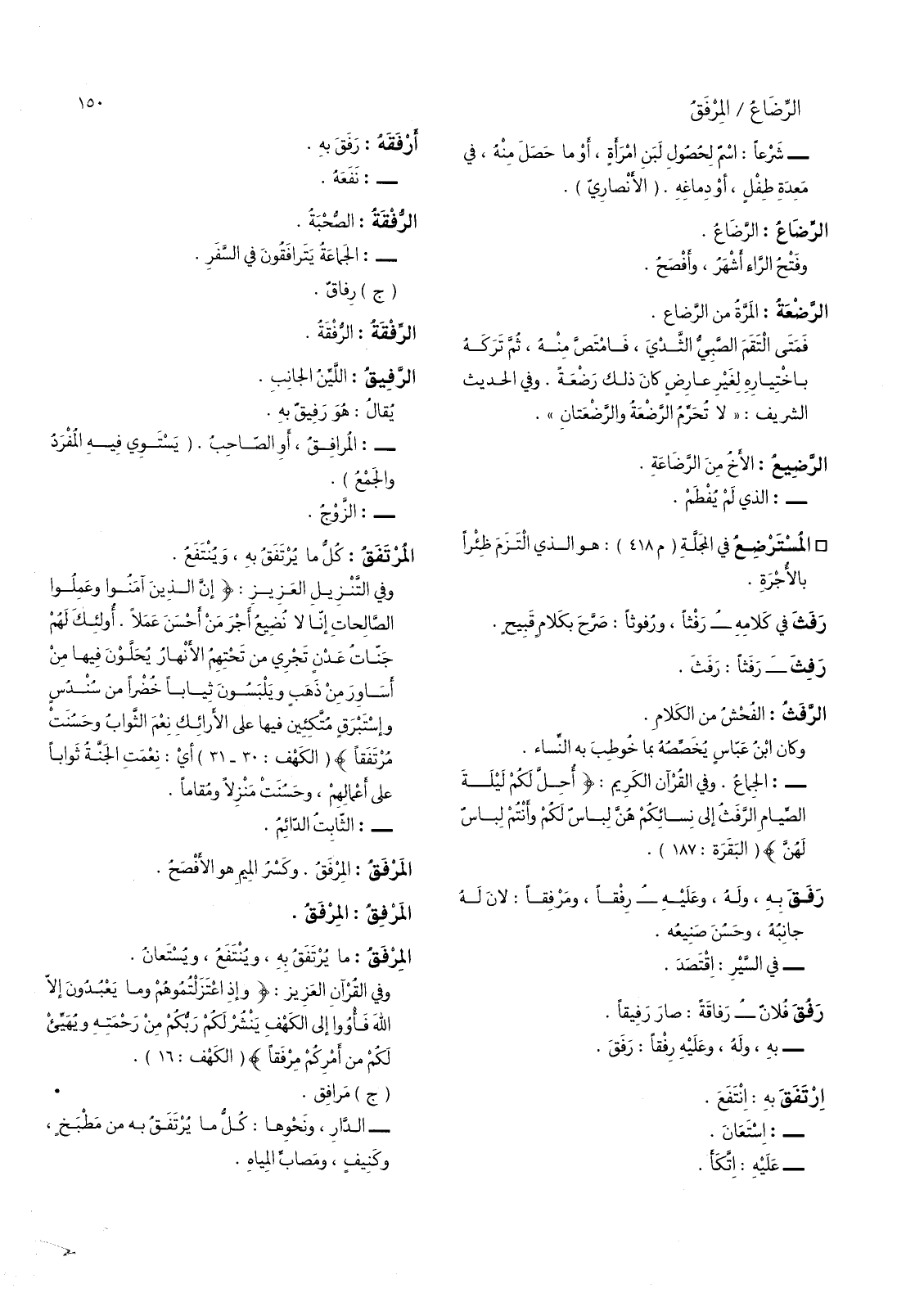 وفي القرآن الكريم: (أحل لكم ليلة الصيام الرفث إلى نسائكم هن لباس لكم وأنتم لباس لهن) (البقرة: 187) رفق به، وله، وعليه - رفقا، ومرفقا: لان له جانبه، وحسن صنيعه.