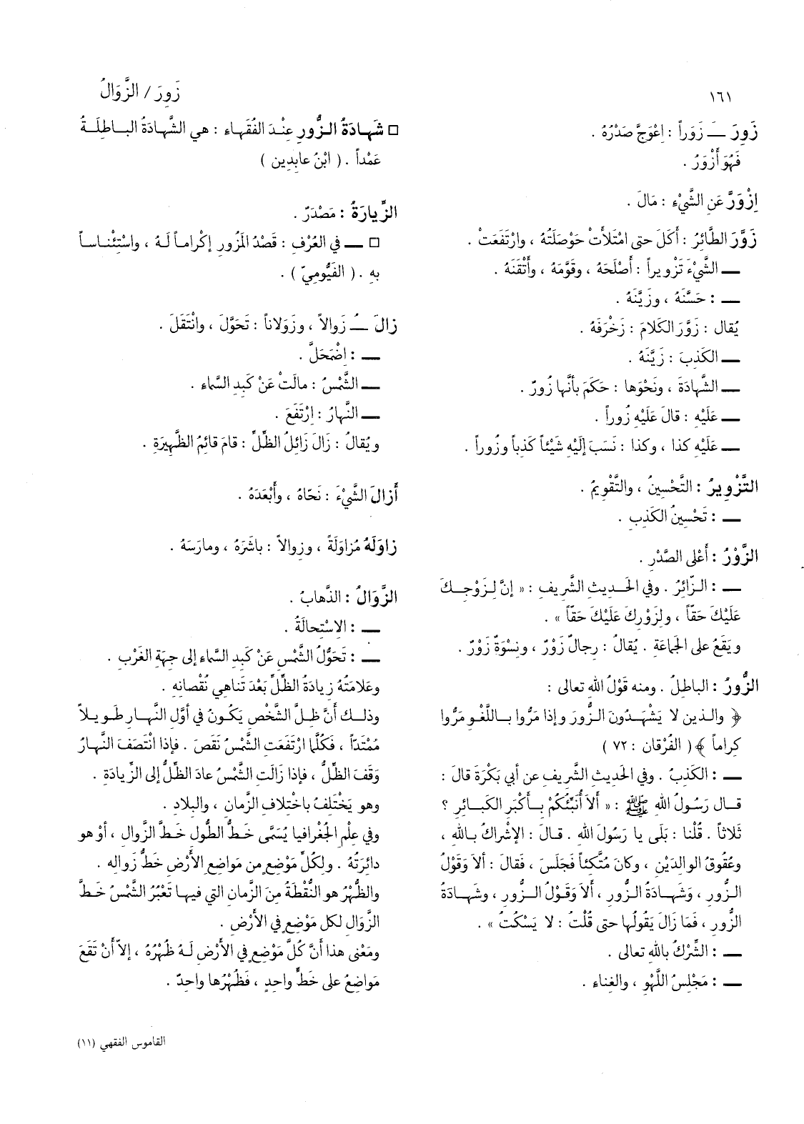 الزور: الباطل، ومنه قول الله تعالى: (والذين لا يشهدون الزور وإذا مرو باللغو مروا كراما) (الفرقان: 72) -: الكذب، وفي الحديث الشريف عن أبي بكرة قال: قال رسول الله صلى الله عليه وسلم: " ألا أنبئكم بأكبر الكبائر؟ ثلاثا.
