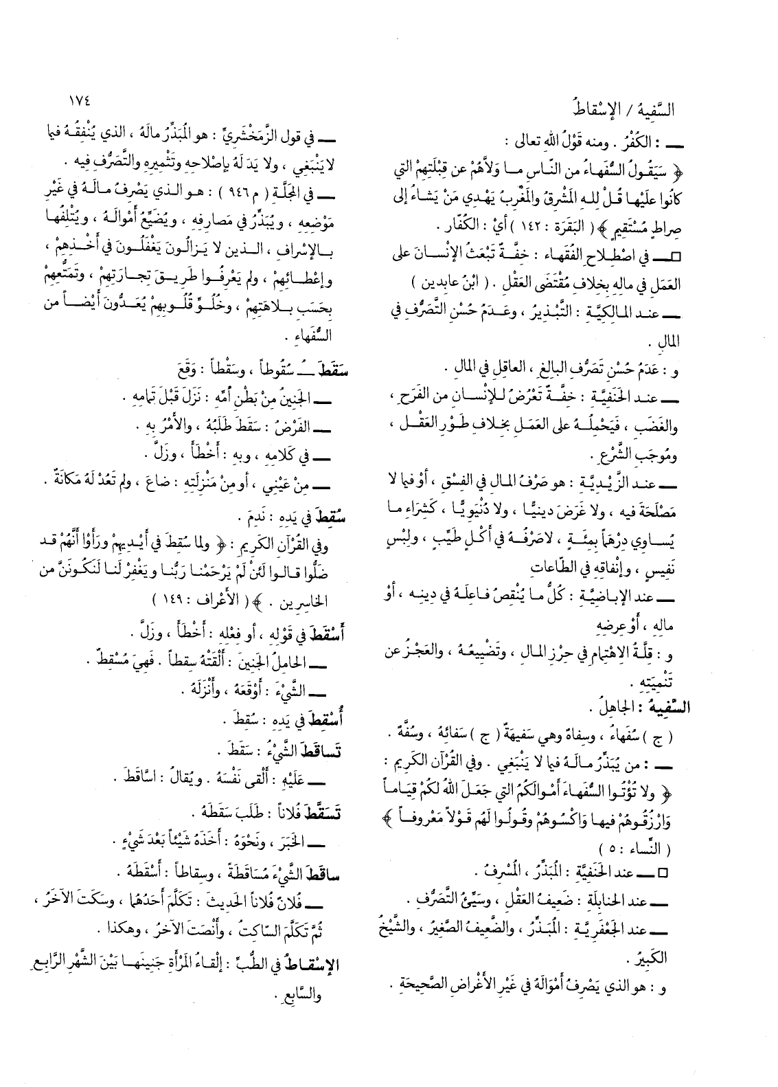 -: من يبذر ماله فيما لا ينبغي، وفي القرآن الكريم: (ولا تؤتوا السفهاء أموالكم التي جعل الله لكم قياما وارزقوهم فيها واكسوهم وقولوا لهم قولا معروفا) (النساء: 5) - عند الحنفية: المبذر، المسرف.
