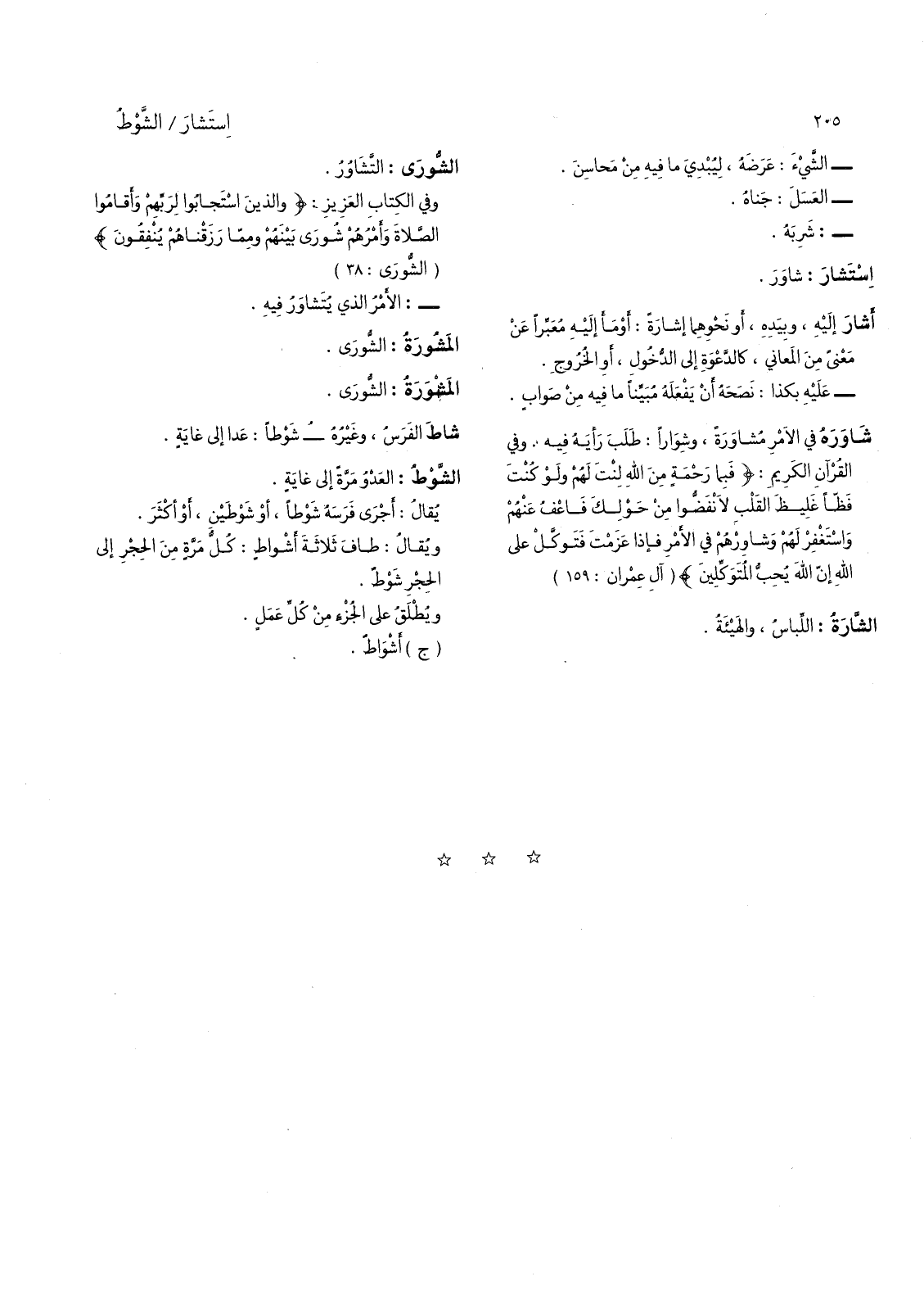 وفي الكتاب العزيز: (والذين استجابوا لربهم وأقاموا الصلاة وأمرهم شورى بينهم ومما رزقناهم ينفقون) (الشورى: 38) -: الامر الذي يتشاور فيه.