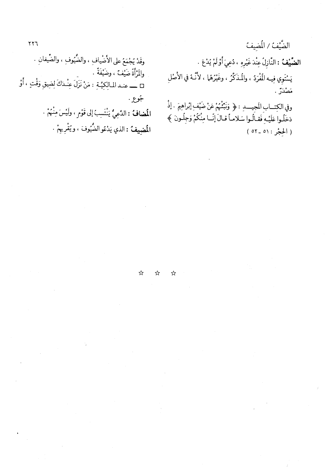 وفي الكتاب المجيد: (ونبئهم عن ضيف إبراهيم إذ دخلوا عليه فقالوا سلاما قال إنا منكم وجلون) (الحجر: 51 - 52) وقد يجمع على الاضياف، والضيوف، والضيفان.