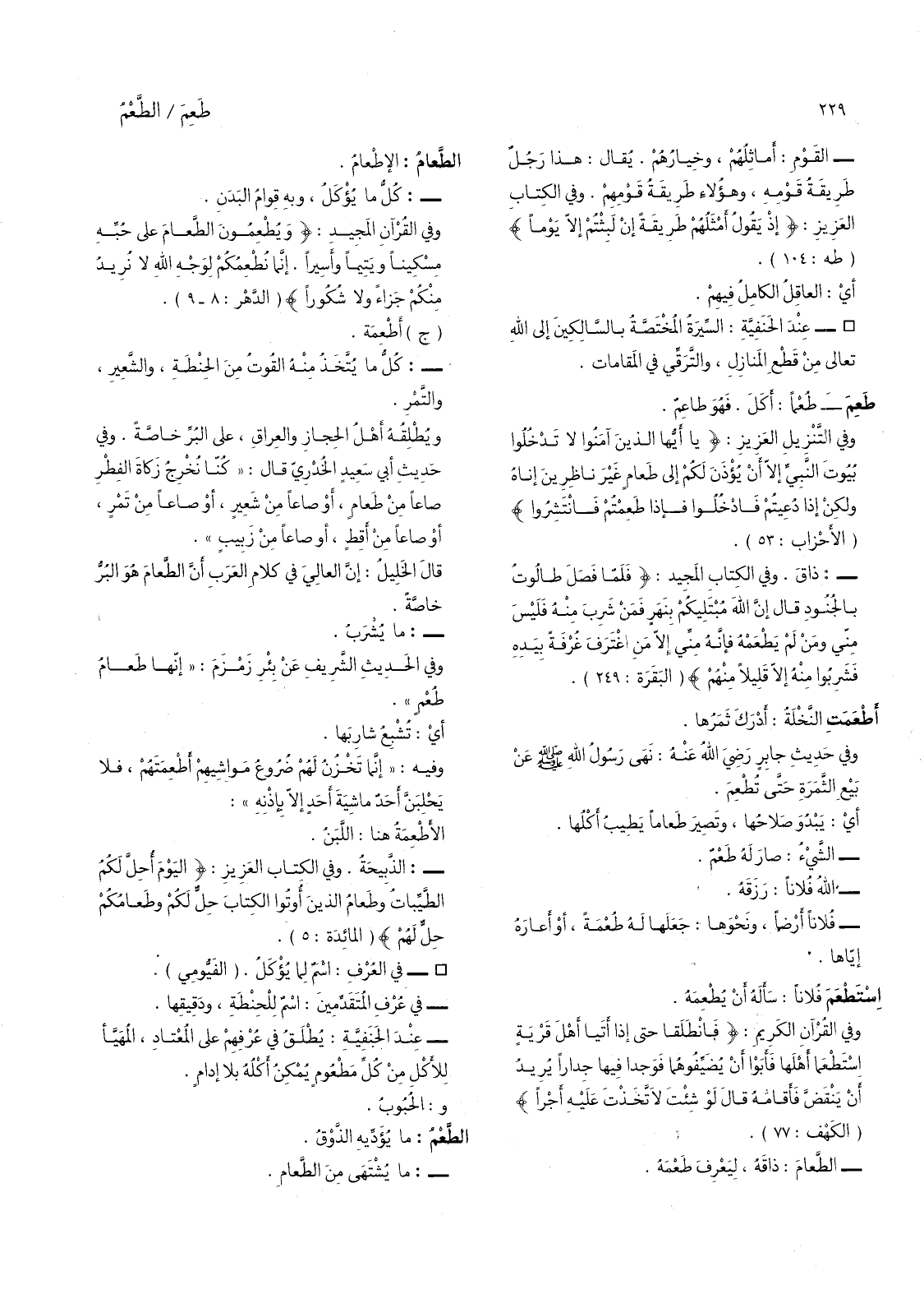 -: الذبيحة، وفي الكتاب العزيز: (اليوم أحل لكم الطيبات وطعام الذين أوتوا الكتاب حل لكم وطعامكم حل لهم) (المائدة: 5) - في العرف: اسم لما يؤكل.