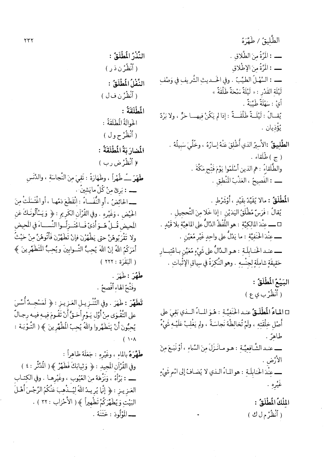النفل المطلق: (انظر ن ف ل) المطلقة: الحوالة المطلقة: (انظر ح ول) المضاربة المطلقة: (اظنر ض رب) طهر - طهرا، وطهارة: نفي من النجاسة، والدنس - برئ من كل ما يشين.