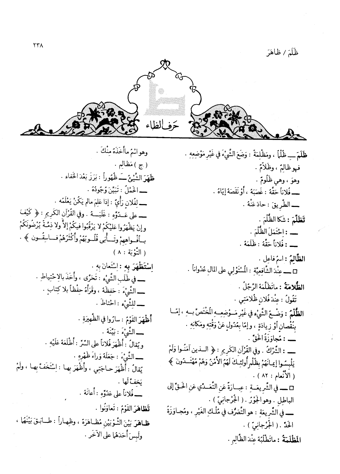 حرف الظاء ظلم - ظلما، ومظلمة: وضع الشئ في غير موضعه.