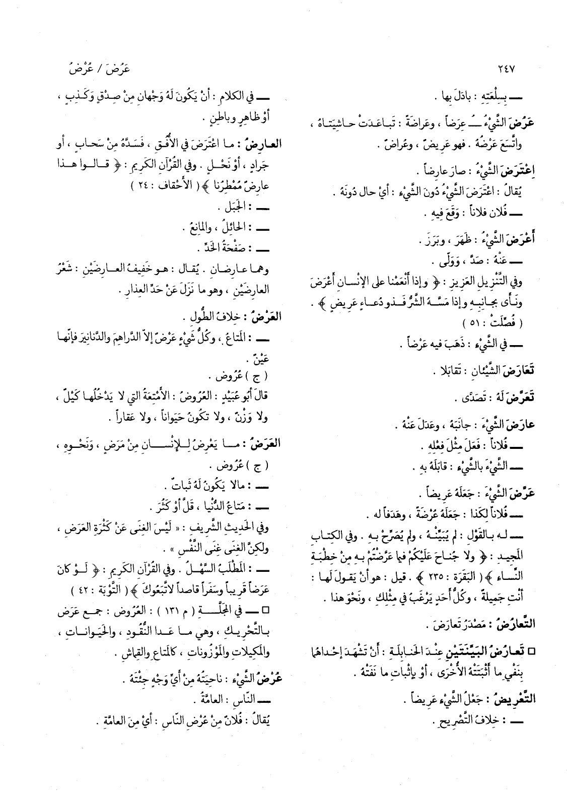 -: المطل السهل، وفي القرآن الكريم: (لو كان عرضا قريبا وسفرا قاصدا لا تبعوك) (التوبة: 42) - في المجلة (م 131) : العروض: جمع عرض بالتحريك، وهي ما عد النقود، والحيوانات، والمكيلات والموزونات، كالمتاع والقماش.