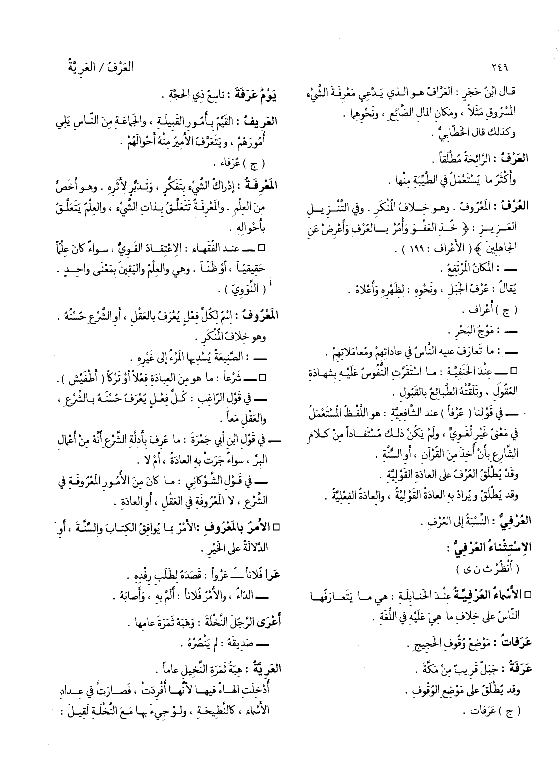 وهو خلاف المنكر، وفي التنزيل العزيز: (خذ العفو وأمر بالعرف وأعرض عن الجاهلين) (الاعراف: 199) -: المكان المرتفع.