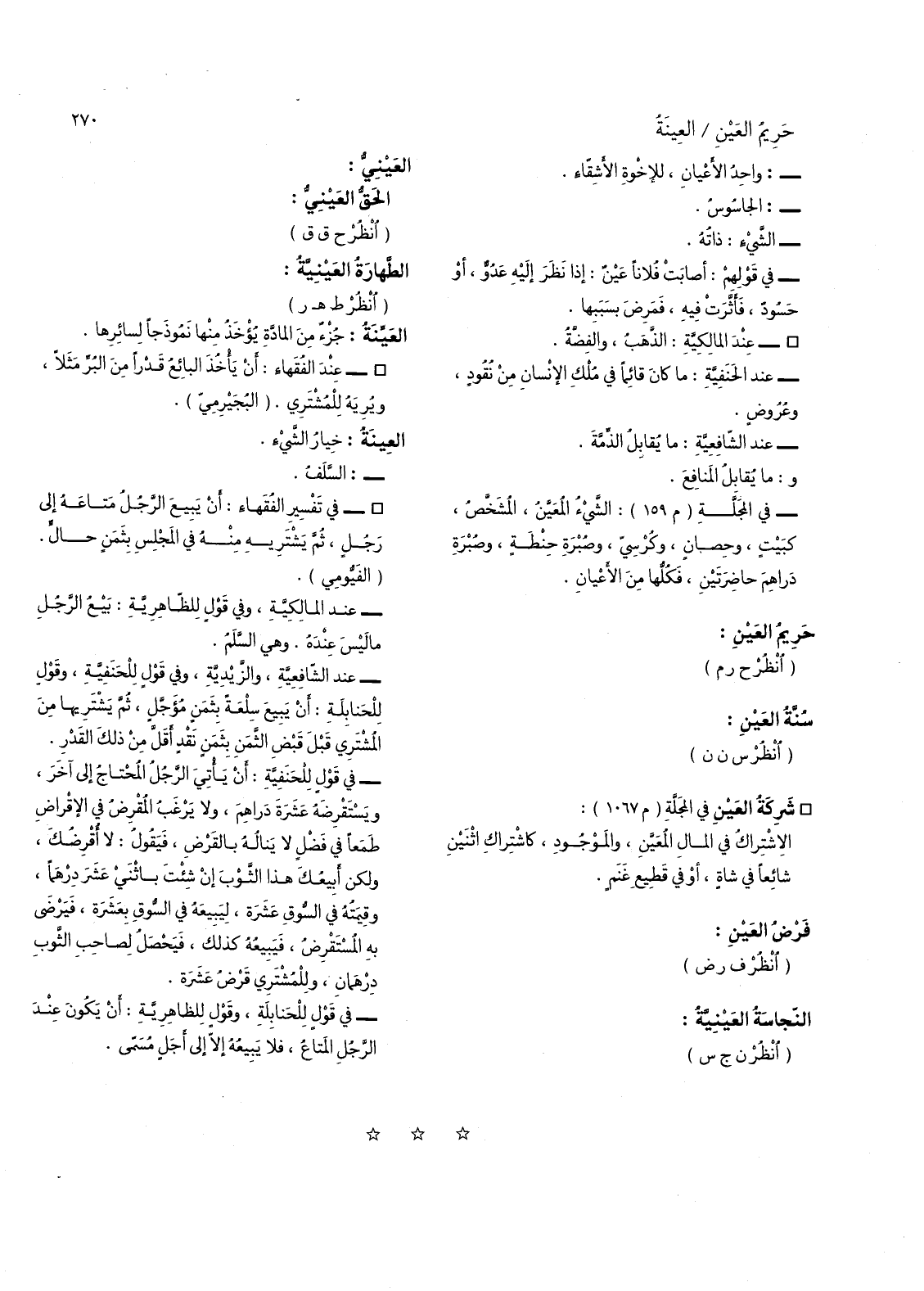 (انظر ح رم) سنة العين: (انظر س ن ن) شركة العين في المجلة (م 1067) : الاشتراك في المال العين.