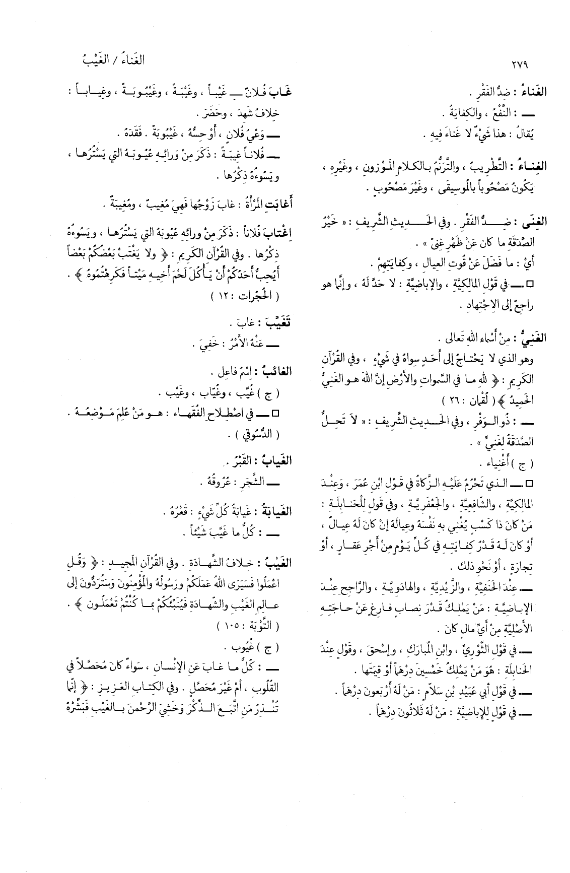 وهو الذي لا يحتاج إلى أحد سواه في شئ، وفي القرآن الكريم: (لله ما في السموات والارض إن الله هو الغني الحميد) (لقمان: 26) -: ذو الوفر، وفي الحديث الشريف: " لا تحل الصدقة لغني ".