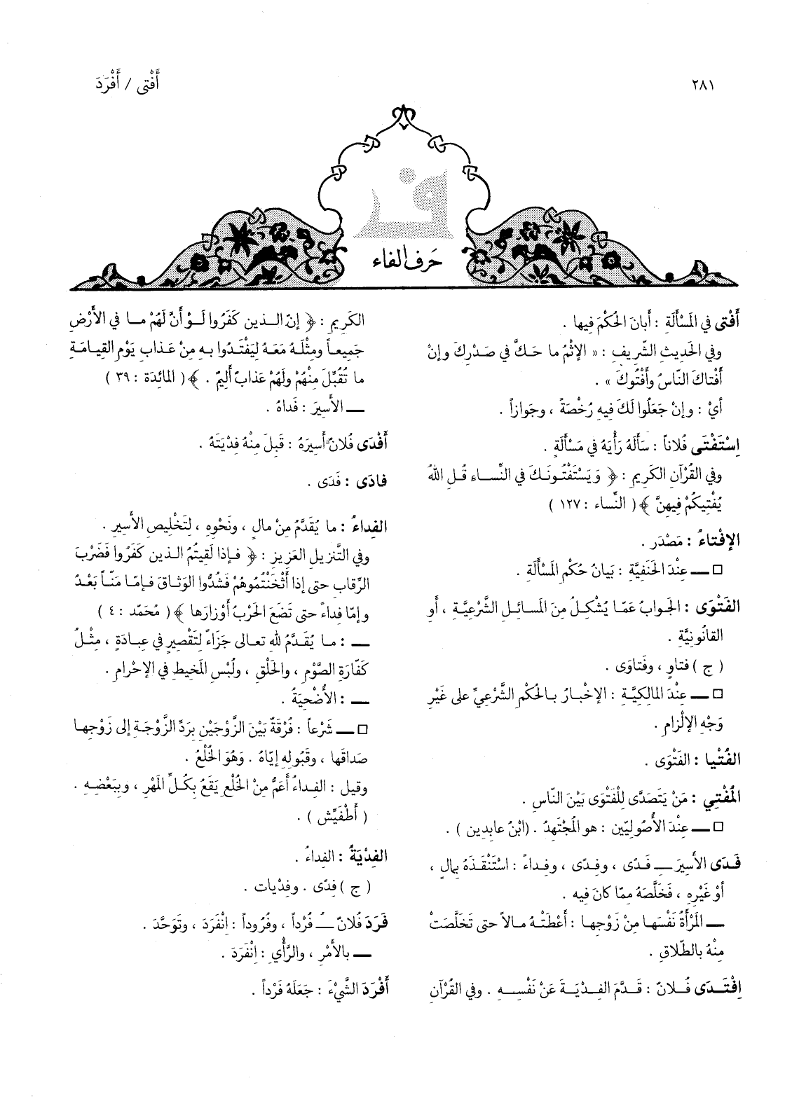 حرف الفاء أفتى في المسألة: أبان الحكم فيها.