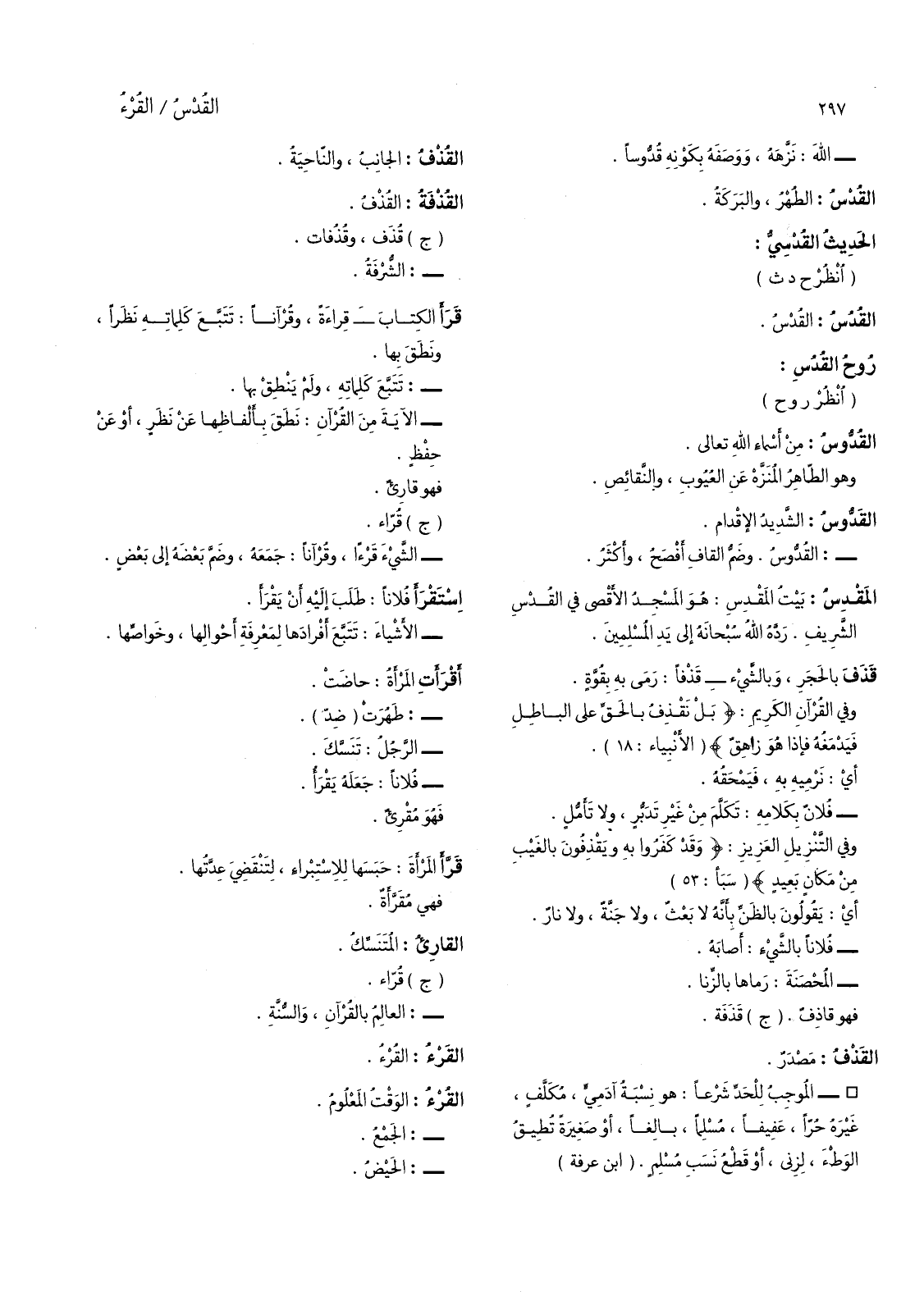 غيره حرا، عفيفا، مسلما، بالغا، أو صغيرة تطيق الوطئ، لزنى، أو قطع نسب مسلم، (ابن عرفة) القذف: الجاب، والناحية.