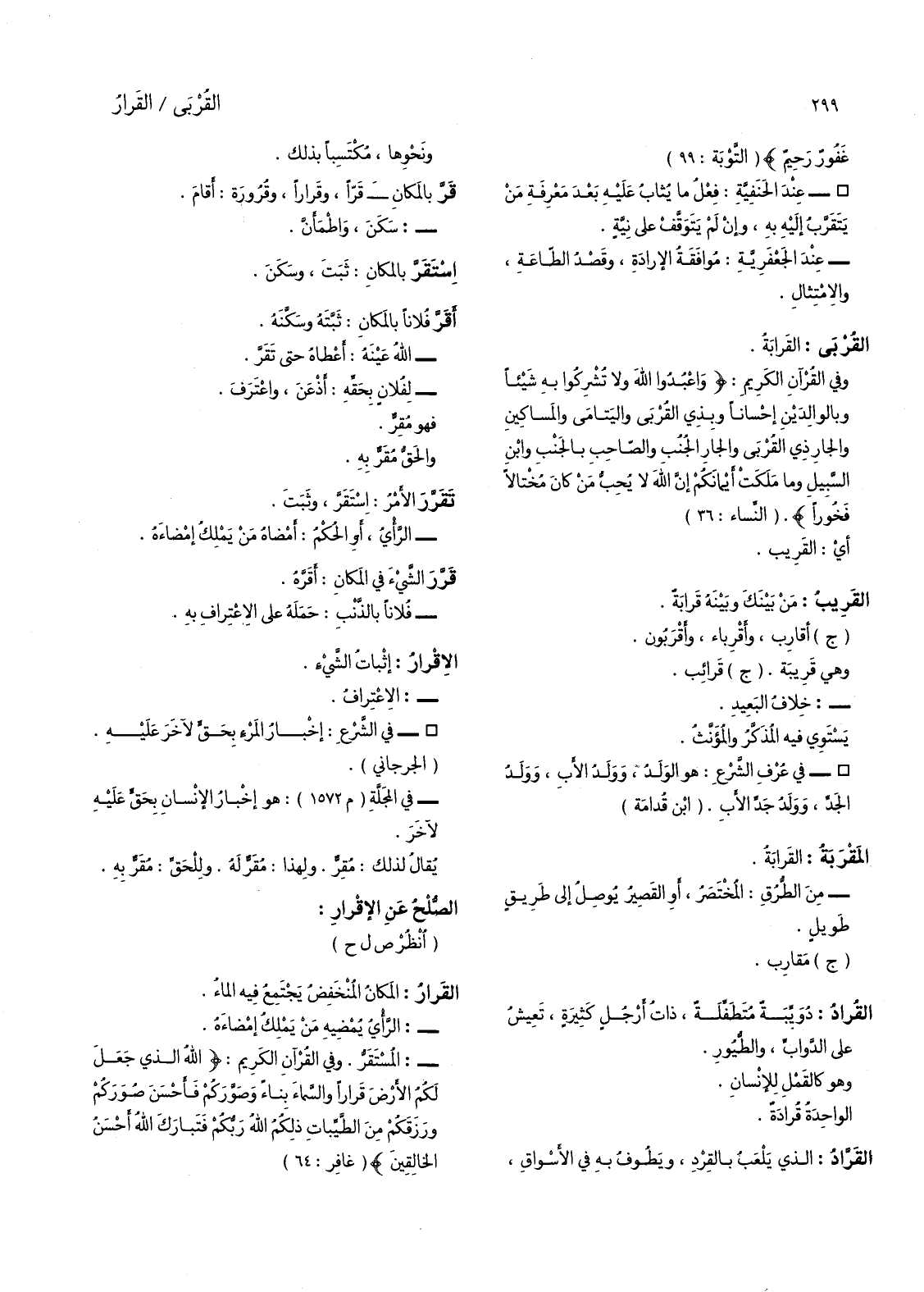-: المستقر، وفي القرآن الكريم: (الله الذي جعل لكم الارض قرارا والسماء بناء وصوركم فأحسن صوركم ورزقكم من الطيبات ذلكم الله ربكم فتبارك الله أحسن الخالقين) (غافر: 64