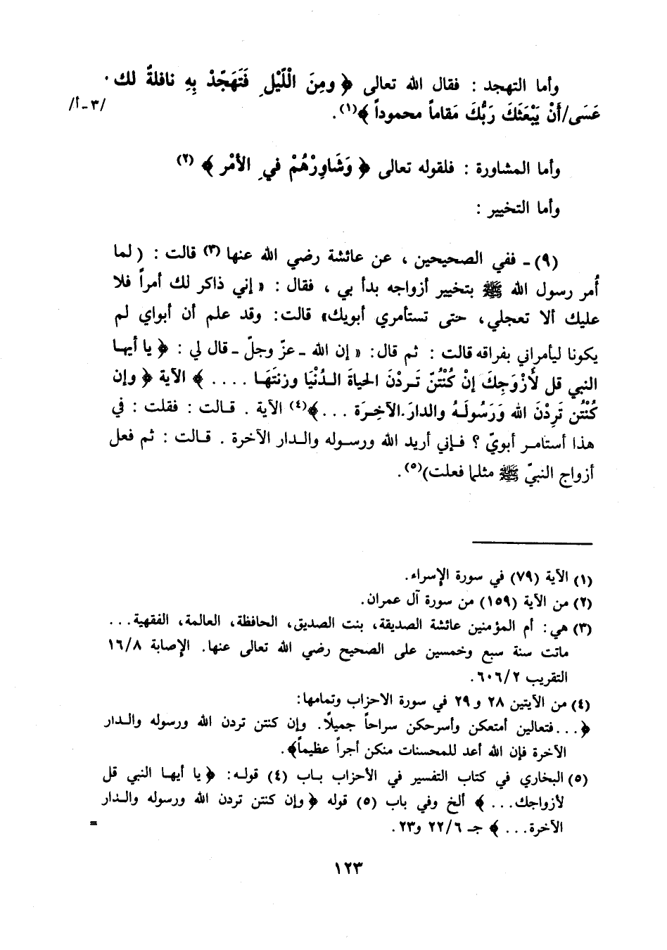 (9) فَفِي الصَّحِيحَيْنِ عَن عَائِشَة رَضِيَ اللَّهُ عَنْها قَالَت لما أَمر رَسُول الله صَلَّى اللَّهُ عَلَيْهِ وَسَلَّم َ بِتَخْيِير أَزوَاجه بَدَأَ بِي فَقَالَ إِنِّي ذَاكر لَك أمرا فَلَا عَلَيْك أَلا تعجلِي حَتَّى تَسْتَأْمِرِي أَبَوَيْك قَالَت وَقد علم أَن أبواي لم يَكُونَا ليأمراني بِفِرَاقِهِ قَالَت ثمَّ قَالَ إِن الله عَزَّ وَجَلَّ قَالَ لي { يَا أَيهَا النَّبِي قل لِأَزْوَاجِك إِن كنتن تردن الْحَيَاة الدُّنْيَا وَزينتهَا } الْآيَة { وَإِن كنتن تردن الله وَرَسُوله وَالدَّار الْآخِرَة } الْآيَة قَالَت فَقلت فِي هَذَا أَستَأْمر أَبَوي فَإِنِّي أُرِيد الله وَرَسُوله وَالدَّار الْآخِرَة قَالَت ثمَّ فعل أَزوَاج النَّبِي صَلَّى اللَّهُ عَلَيْهِ وَسَلَّم َ مِثْلَمَا فعلت