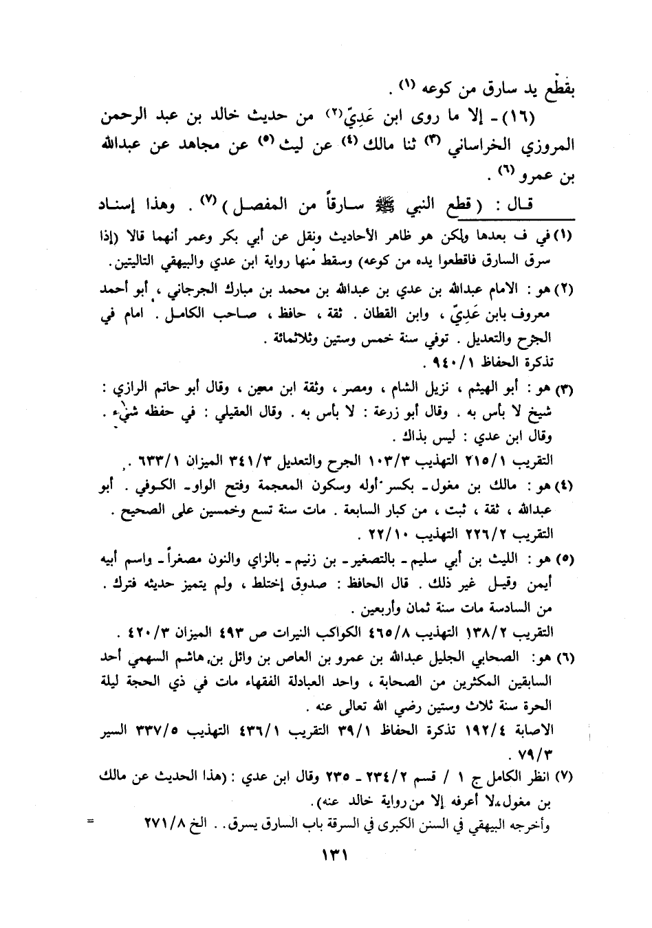 (16) إِلَّا مَا رَوَى ابْن عدي من حَدِيث خَالِد بن عبد الرَّحْمَن الْمروزِي الخرساني ثَنَا مَالك عَن لَيْث عَن مُجَاهِد عَن عبد الله بن عَمْرو قَالَ قطع النَّبِي صَلَّى اللَّهُ عَلَيْهِ وَسَلَّم َ سَارِقا من الْمفصل وَهَذَا إِسْنَاد