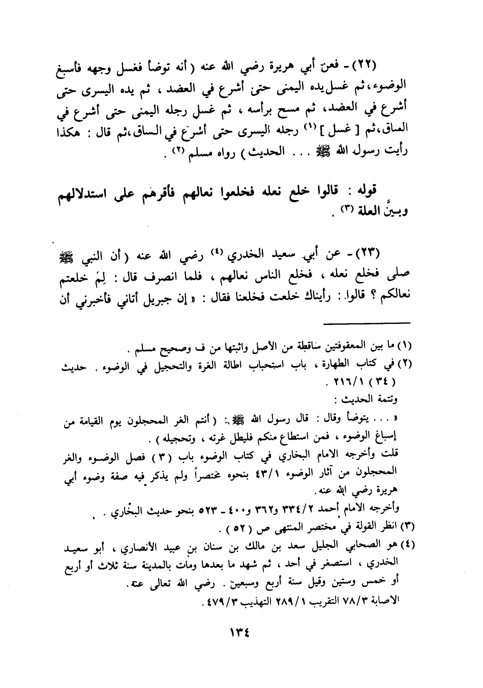 (22) فَعَن أبي هُرَيْرَة رَضِيَ اللَّهُ عَنْه أَنه تَوَضَّأ فَغسل وَجهه فأسبغ الْوضُوء ثمَّ غسل يَده الْيُمْنَى حَتَّى أشرع فِي الْعَضُد ثمَّ يَده الْيُسْرَى حَتَّى أشرع فِي الْعَضُد ثمَّ مسح بِرَأْسِهِ ثمَّ غسل رجله الْيُمْنَى حَتَّى أشرع فِي السَّاق ثمَّ غسل رجله الْيُسْرَى حَتَّى أشرع فِي السَّاق ثمَّ قَالَ هَكَذَا رَأَيْت رَسُول الله صَلَّى اللَّهُ عَلَيْهِ وَسَلَّم َ الحَدِيث رَوَاهُ مُسلم
