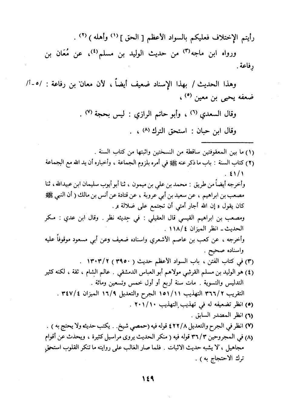 رَأَيْتُمْ الإختلاف فَعَلَيْكُم بِالسَّوَادِ الْأَعْظَم الْحق وَأَهله وَرَوَاهُ ابْن مَاجَه من حَدِيث الْوَلِيد بن مُسلم عَن معَان بن رِفَاعَة