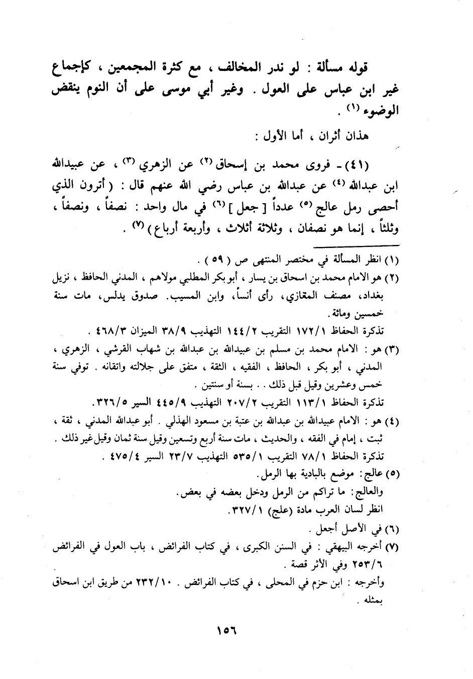 (41) فروَى مُحَمَّد بن اسحاق عَن الزُّهْرِيّ عَن عبيد الله ابْن عبد الله عَن عبد الله بن عَبَّاس رَضِيَ اللَّهُ عَنْهم قَالَ أَتَرَوْنَ الَّذِي أحصى رمل عالج عددا جعل فِي مَال وَاحِد نصفا وَنصفا وَثلثا إِنَّمَا هونصفان وَثَلَاثَة اثلاث وَأَرْبَعَة أَربَاع