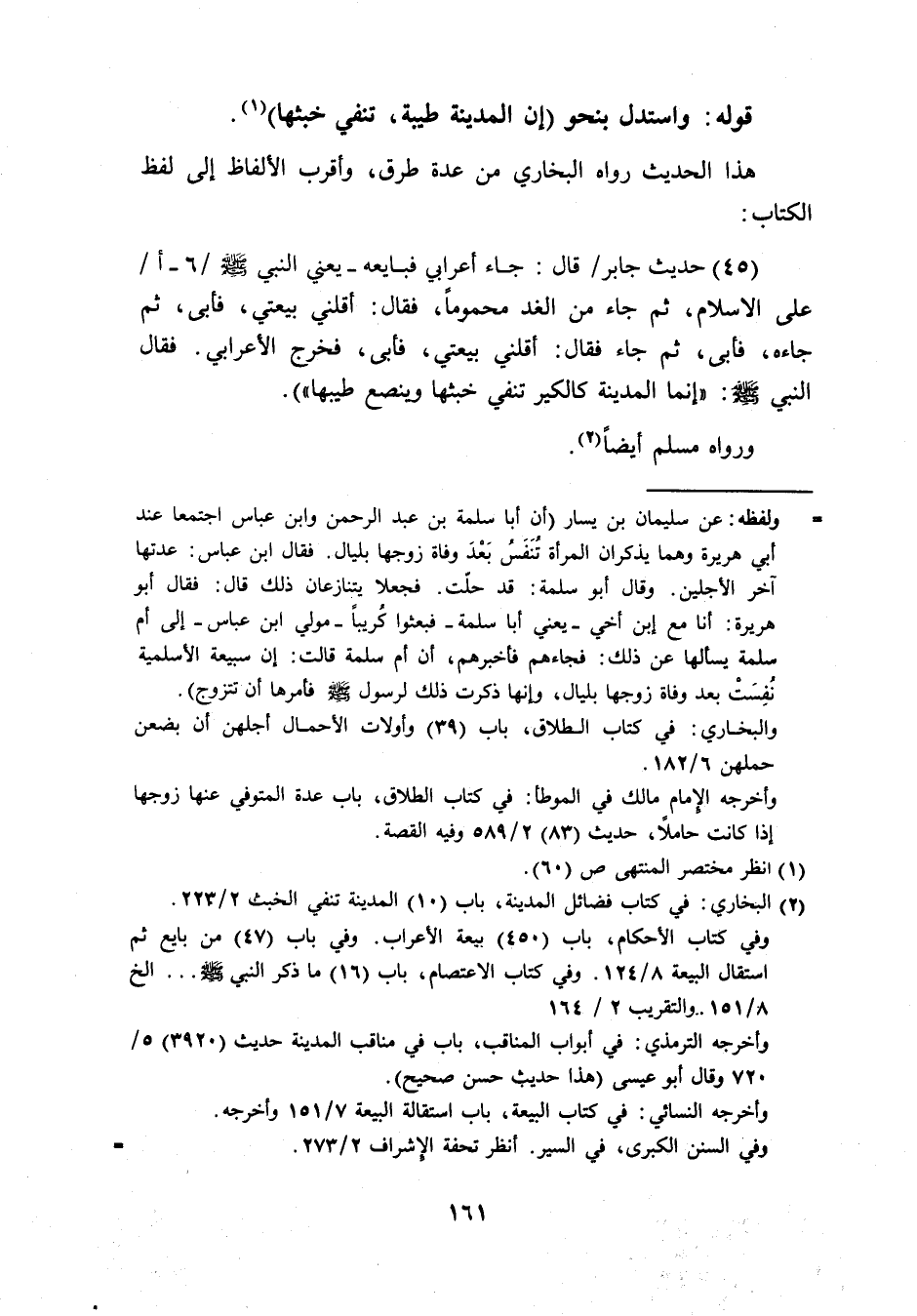 (45) حَدِيث جَابر قَالَ جَاءَ أَعْرَابِي فَبَايعهُ يَعْنِي النَّبِي صَلَّى اللَّهُ عَلَيْهِ وَسَلَّم َ 6 أ عَلَى الاسلام ثمَّ جَاءَ من الْغَد محموما فَقَالَ اقلني بيعتي فَأَبَى ثمَّ جَاءَهُ فَأَبَى ثمَّ جَاءَ فَقَالَ أَقلنِي بيعتي فَأَبَى فَخرج الاعرابي فَقَالَ النَّبِي صَلَّى اللَّهُ عَلَيْهِ وَسَلَّم َ إِنَّمَا الْمَدِينَة كالكير تنفيى خبثها وينصع طيبها وَرَوَاهُ مُسلم أَيْضا