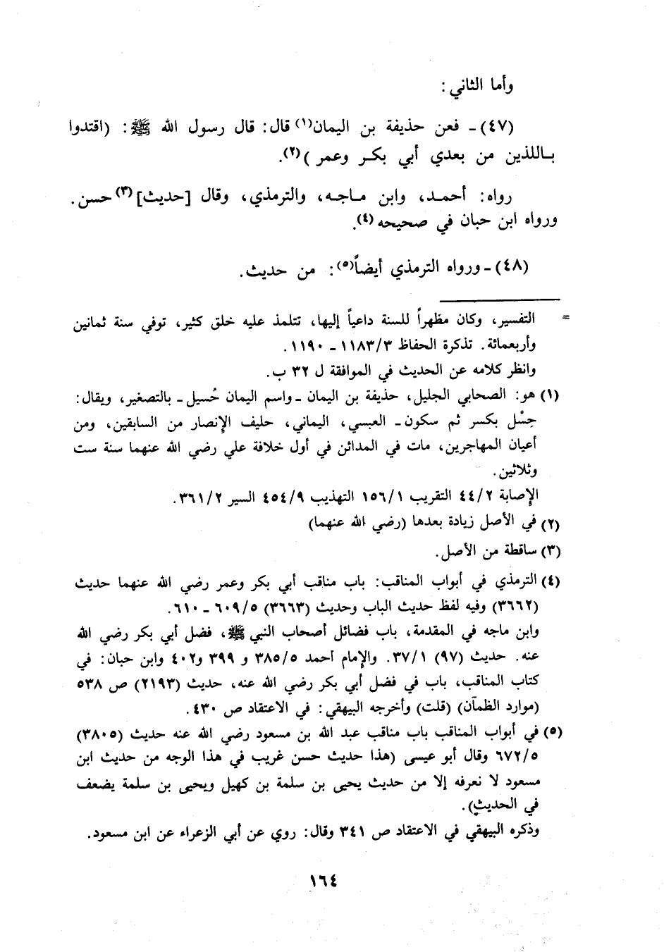 (47) فَعَن حُذَيْفَة بن الْيَمَان قَالَ قَالَ رَسُول الله صَلَّى اللَّهُ عَلَيْهِ وَسَلَّم َ اقتدوا باللذين من بعدِي أبي بكر وَعمر وَرَوَاهُ أَحْمد وَابْن مَاجَه وَالتِّرْمِذِيّ وَقَالَ حَدِيث حسن وَرَوَاهُ اببن حبَان فِي صَحِيحه