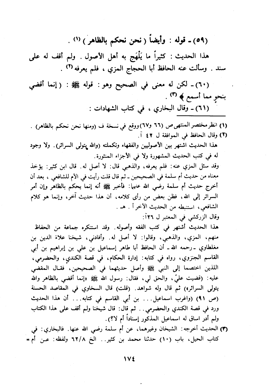 (59) قَوْله وايضا نَحن نحكم بِالظَّاهِرِ هَذَا الحَدِيث كثيرا مَا يلهج بِهِ اهل الاصول وَلم اقف لَهُ عَلَى سَنَد وَسَأَلت عَنهُ الْحَافِظ ابا الْحجَّاج الْمزي فَلم يعرفهُ