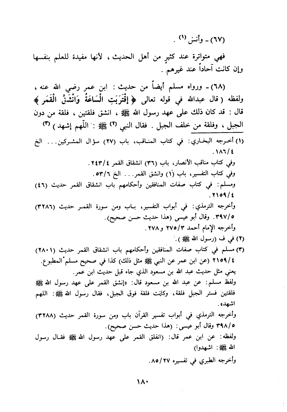 (67) وَأنس فَهِيَ متواترة عِنْد كثير من أهل الحَدِيث لِأَنَّهَا مفيدة للْعلم بِنَفسِهَا وَإِن كَانَت آحادا عِنْد غَيرهم