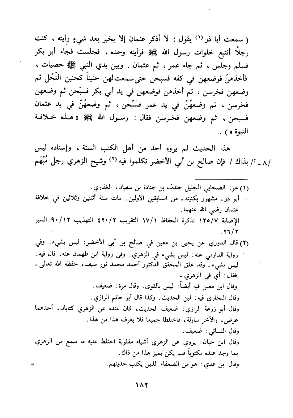 هَذَا الحَدِيث لم يروه أحد من أهل الْكتب السِّتَّة وَإِسْنَاده لَيْسَ 8 أ بِذَاكَ فَإِن صَالح بن ابي الْأَخْضَر تكلمُوا فِيهِ وَشَيخ الزُّهْرِيّ رجل مُبْهَم