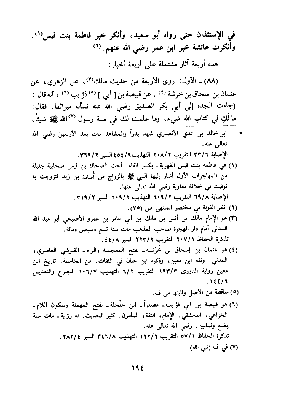 (88) الاول رَوَى الاربعة من حَدِيث مَالك عَن الزُّهْرِيّ عَن عُثْمَان بن اسحاق بن خَرشَة عَن قبيصَة بن أبي ذُؤَيْب أَنه قَالَ جَاءَت الْجدّة إِلَى أبي بكر الصّديق رَضِيَ اللَّهُ عَنْه تسأله مِيرَاثهَا فَقَالَ مَا لَك فِي كتاب الله شَيْء وَمَا علمت لَك فِي سنة رَسُول الله صَلَّى اللَّهُ عَلَيْهِ وَسَلَّم َ شَيْئا
