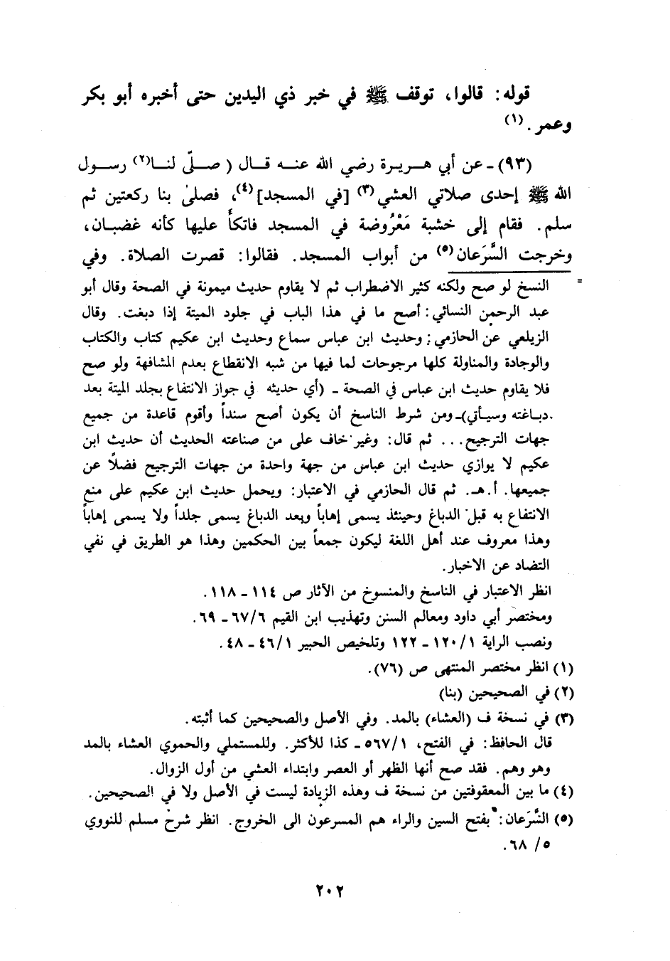 (93) عَن ابي هُرَيْرَة رَضِيَ اللَّهُ عَنْه قَالَ صَلَّى لنا رَسُول الله صَلَّى اللَّهُ عَلَيْهِ وَسَلَّم َ أحدى صَلَاتي الْعشي فِي الْمَسْجِد فَصَلى بِنَا رَكْعَتَيْنِ ثمَّ سلم فَقَامَ الى خَشَبَة معروضة فِي الْمَسْجِد فاتكأ عَلَيْهَا كَأَنَّهُ غَضْبَان وَخرجت السرعان من ابواب الْمَسْجِد فَقَالُوا قصرت الصَّلَاة وَفِي