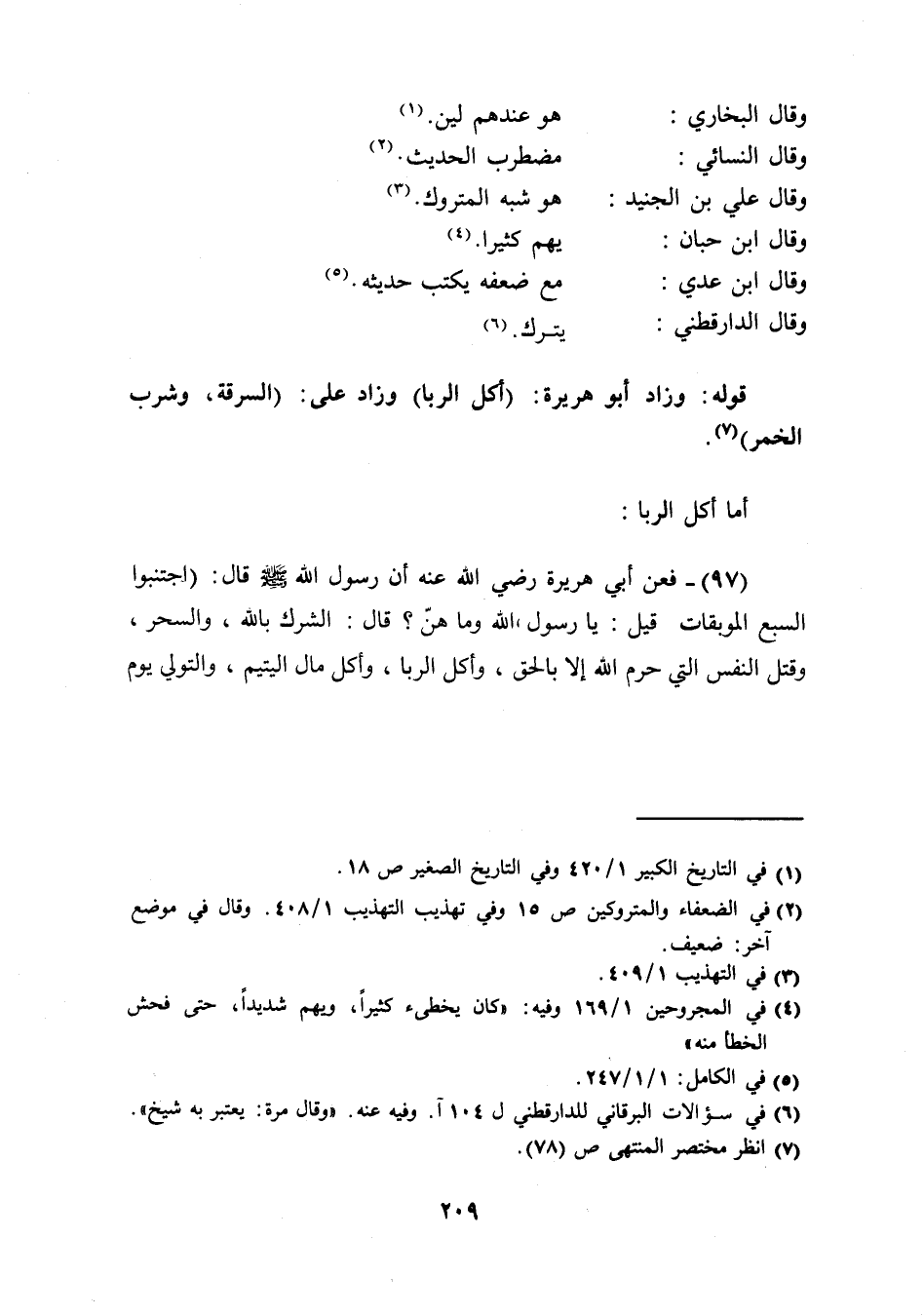 (97) فَعَن أبي هُرَيْرَة رَضِيَ اللَّهُ عَنْه أَن رَسُول الله صَلَّى اللَّهُ عَلَيْهِ وَسَلَّم َ قَالَ أجتنبوا السَّبع الموبقات قيل يَا رَسُول الله وَمَا هن قَالَ الشّرك بِاللَّه وَالسحر وَقتل النَّفس الَّتِي حرم الله إِلَّا بِالْحَقِّ واكل الرِّبَا واكل مَال الْيَتِيم والتولي يَوْم