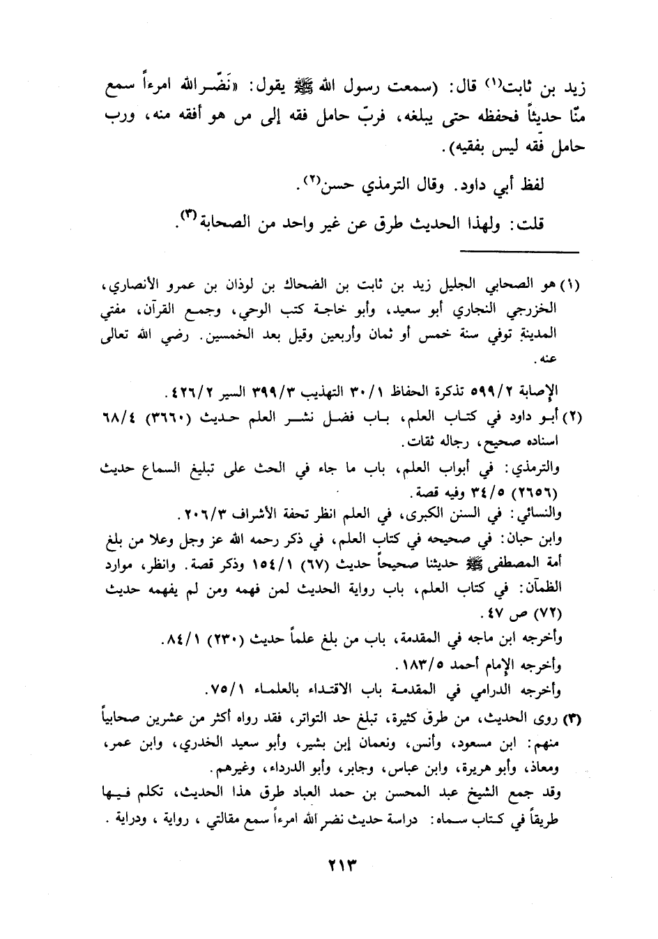 زيد بن ثَابت قَالَ سَمِعت رَسُول الله صَلَّى اللَّهُ عَلَيْهِ وَسَلَّم َ يَقُول نضر الله امْرَءًا سمع منا حَدِيثا فحفظه حَتَّى يبلغهُ فَرب حَامِل فقه الى من هُوَ أفقه مِنْهُ وَرب حَامِل فقه لَيْسَ بفقيه لفظ أبي دَاوُد وَقَالَ التِّرْمِذِيّ حسن قلت وَلِهَذَا الحَدِيث طرق عَن غير وَاحِد من الصَّحَابَة